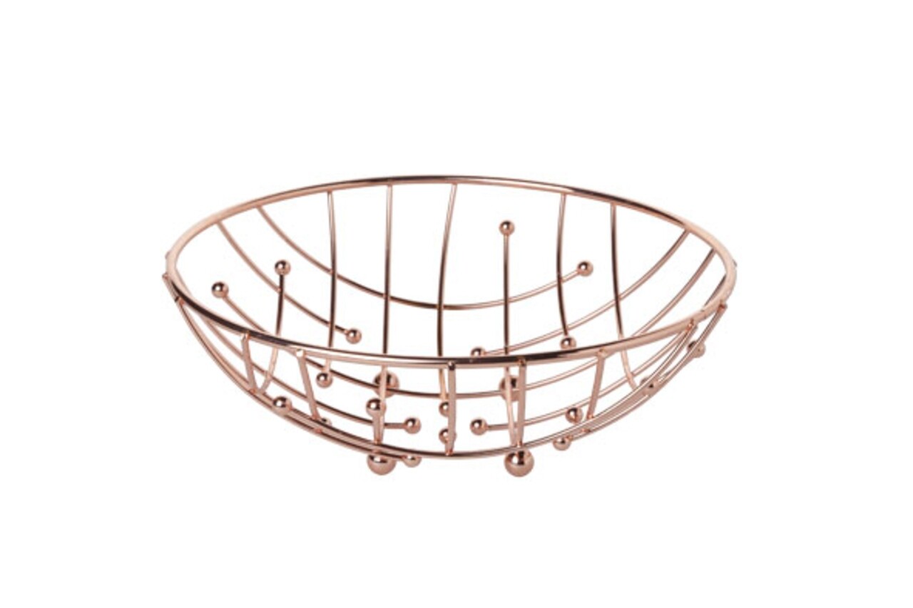Alege cosul de fructe, metalic, cu finisaj de cupru, pentru a pastra la indemana fructele preferate! Design modern. Este prevazut cu 4 picioare, care ii ofera o stabilitate buna.