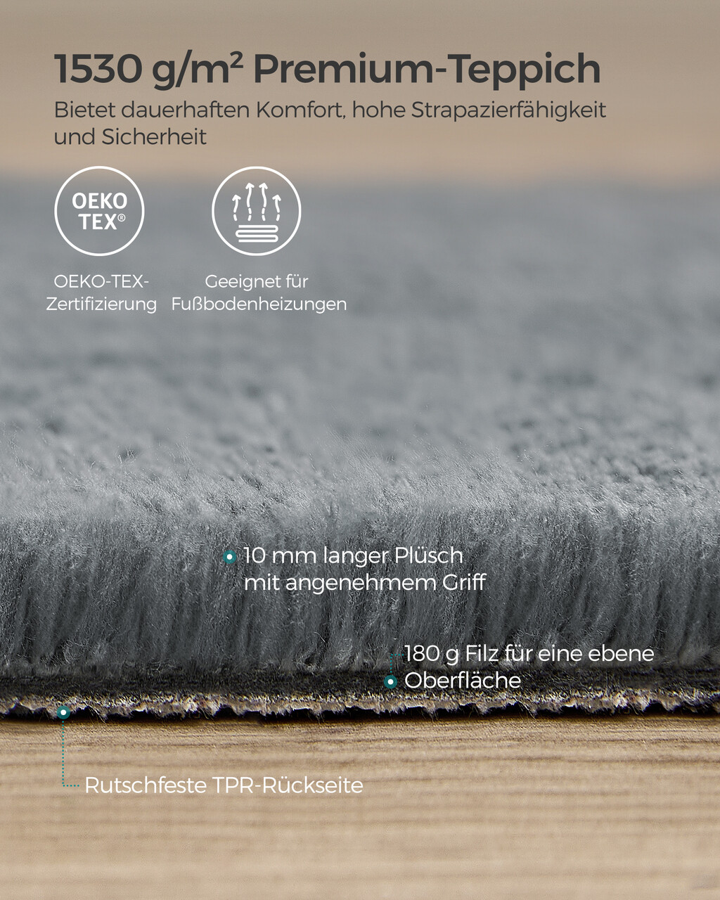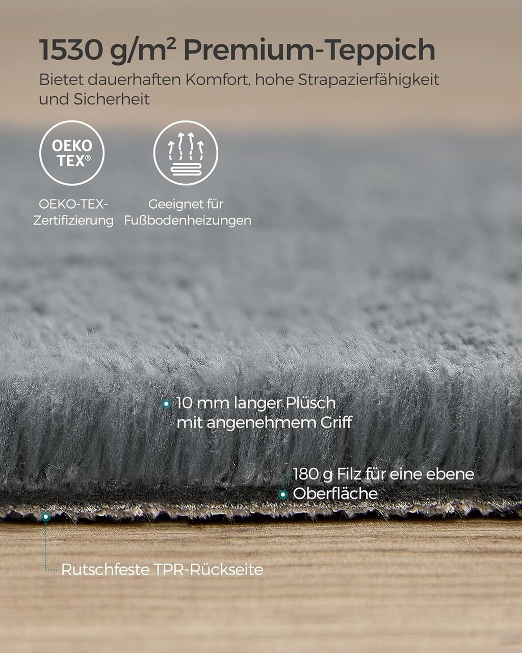 Moale si sigur Fabricat din 100% fibre de poliester, acest covor asigura o atingere moale. Este certificat OEKO-TEX Standard 100, care indeplineste cele mai stricte standarde de siguranta textila (Numar certificat: SHO25 152411).