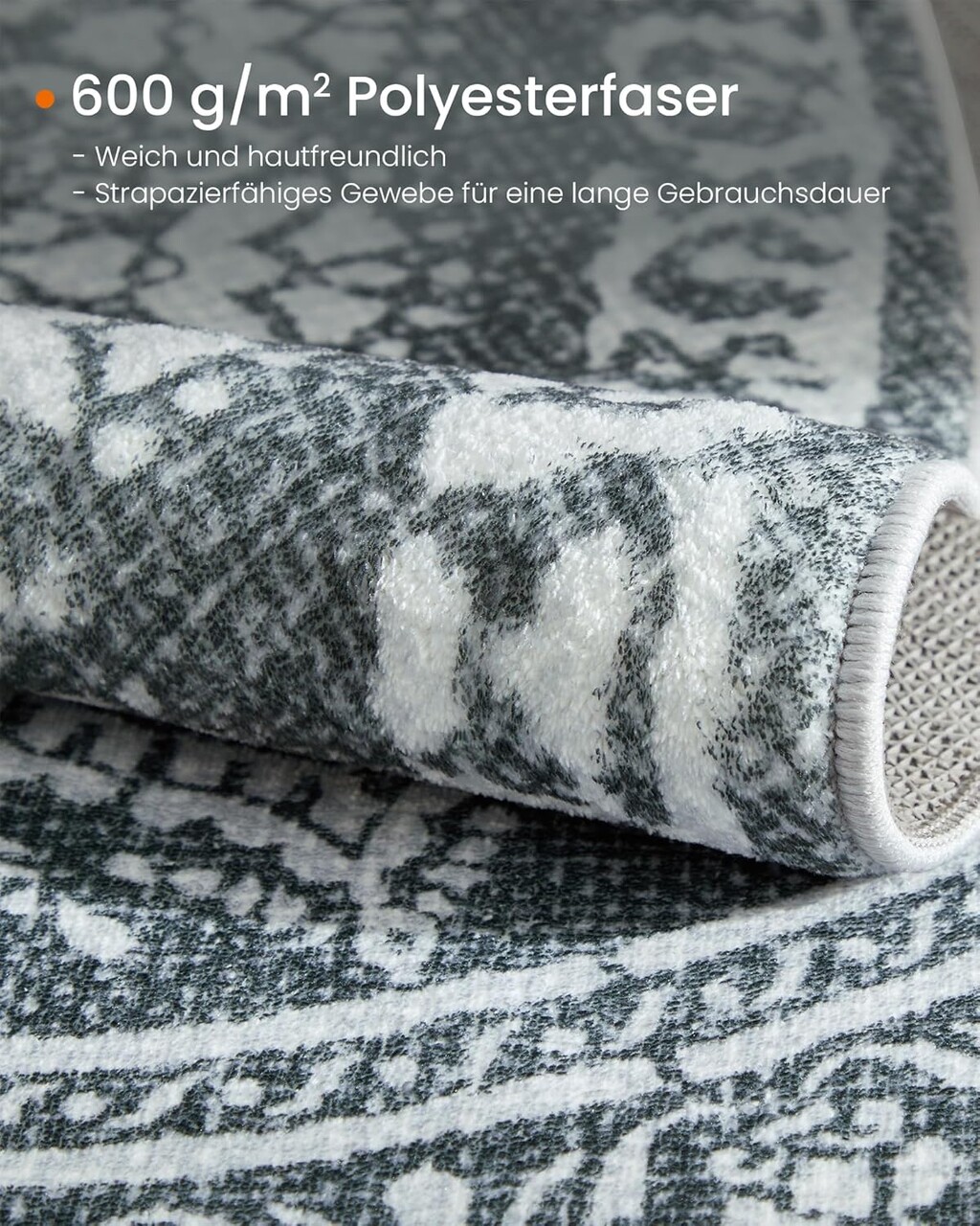 Antiderapant si versatil: partea din spate a covorului este fabricata din TPR (cauciuc termoplastic) si, prin urmare, este deosebit de antiderapanta, astfel incat este potrivita pentru diferite tipuri de podele, de exemplu, pentru lemn de esenta tare, gresie si altele.