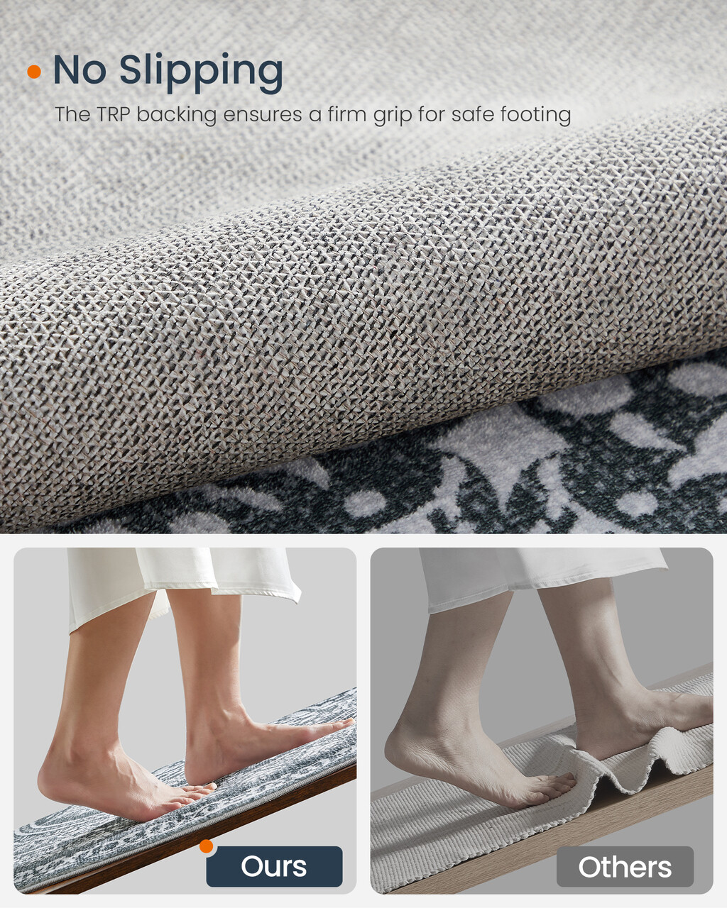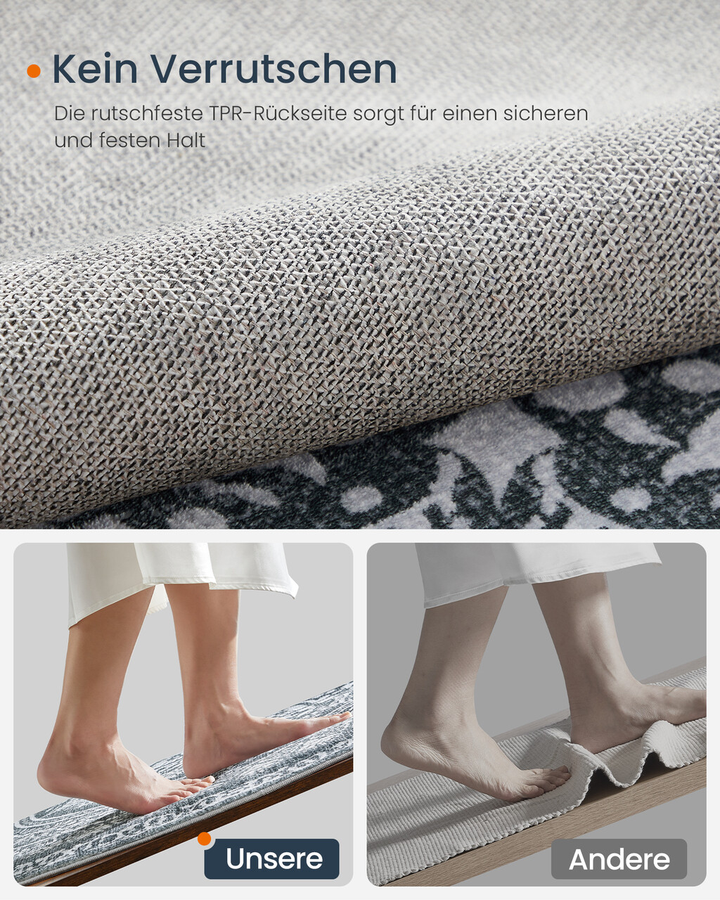 Antiderapant si versatil: partea din spate a covorului este fabricata din TPR (cauciuc termoplastic) si, prin urmare, este deosebit de antiderapanta, astfel incat este potrivita pentru diferite tipuri de podele, de exemplu, pentru lemn de esenta tare, gresie si altele.