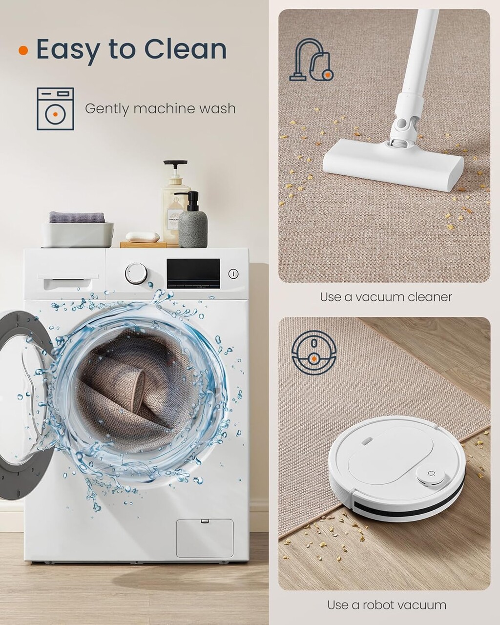 Intretinere usoara, lavabil la masina Acest covor este usor de curatat. Pentru curatarea zilnica, utilizati un aspirator robot sau scuturati-l praful. Pentru o curatare mai profunda, il puteti spala la masina. Chiar si dupa mai multe spalari, acesta isi va pastra calitatea si frumusetea.