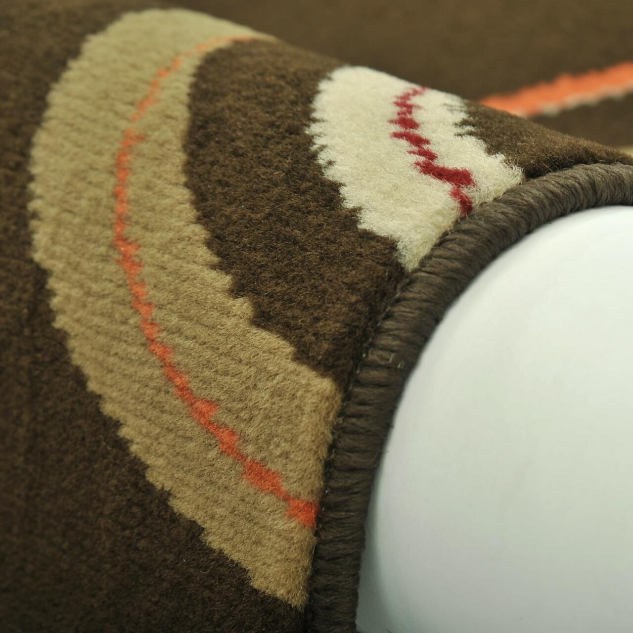 Acest covor este un produs realizat din polipropilena de cea mai buna calitate, cu firul lung de 7 mm, prezentant un confort deosebit si un aspect clasic. Culorile naturale, placute, de portocaliu, crem, rosu si alb pe fondul maro inchis, aduc o senzatie de caldura in spatiul decorat cu acest produs. Liniile cercuite, concentrice, ofera spatialitate designului interior si completeaza stilul ales pentru decorul interior.