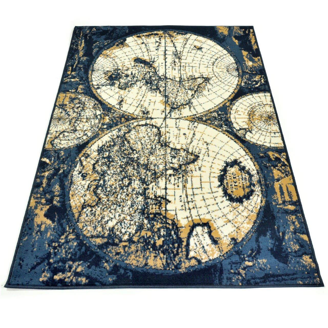 Superbul covor exprima rafinament si calitate. Combinatia minunata de culori, de crem si albastru, si modelele cu harta lumii, cu globul pamantesc, toate stilizate, aduc o nota originala si unica spatiului de locuit.