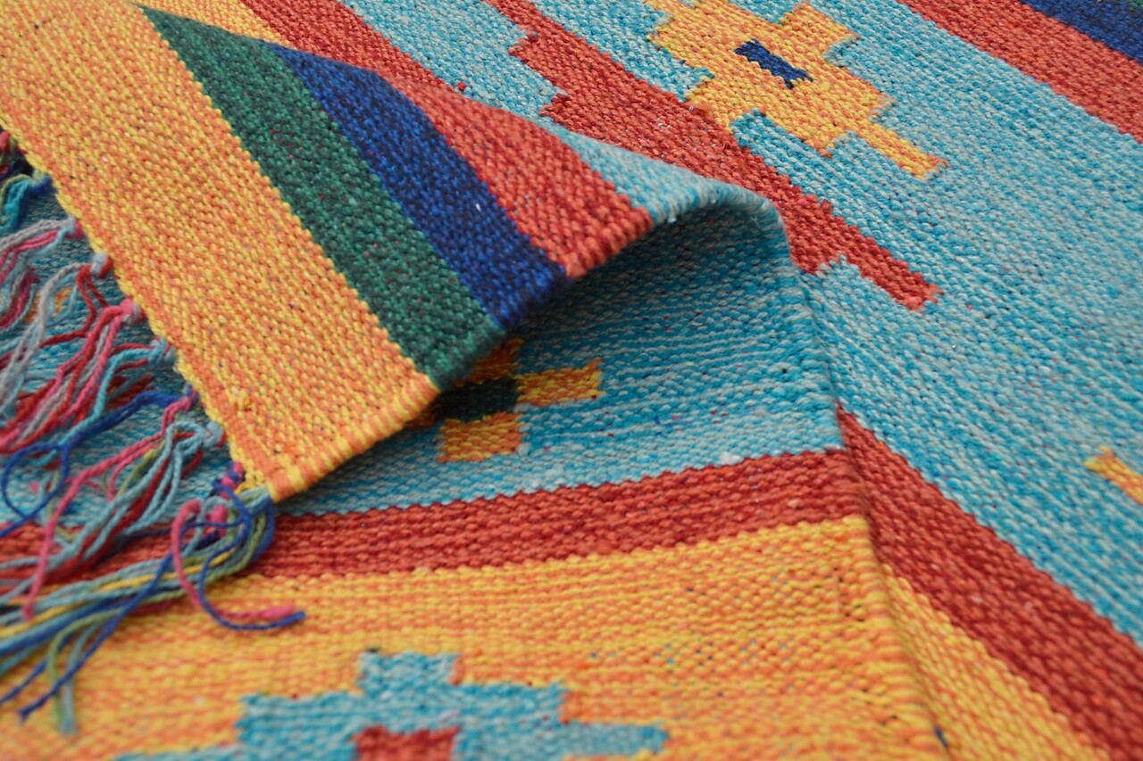 Covorul Country Modern 346 de la Bakero este un covor kilim cu model mexican care iti va lumina casa. Acest produs este foarte popular in toata Europa. Covorul este tesut manual din 100% bumbac. Se termina cu franjuri pe ambele parti. Fabricat in India.