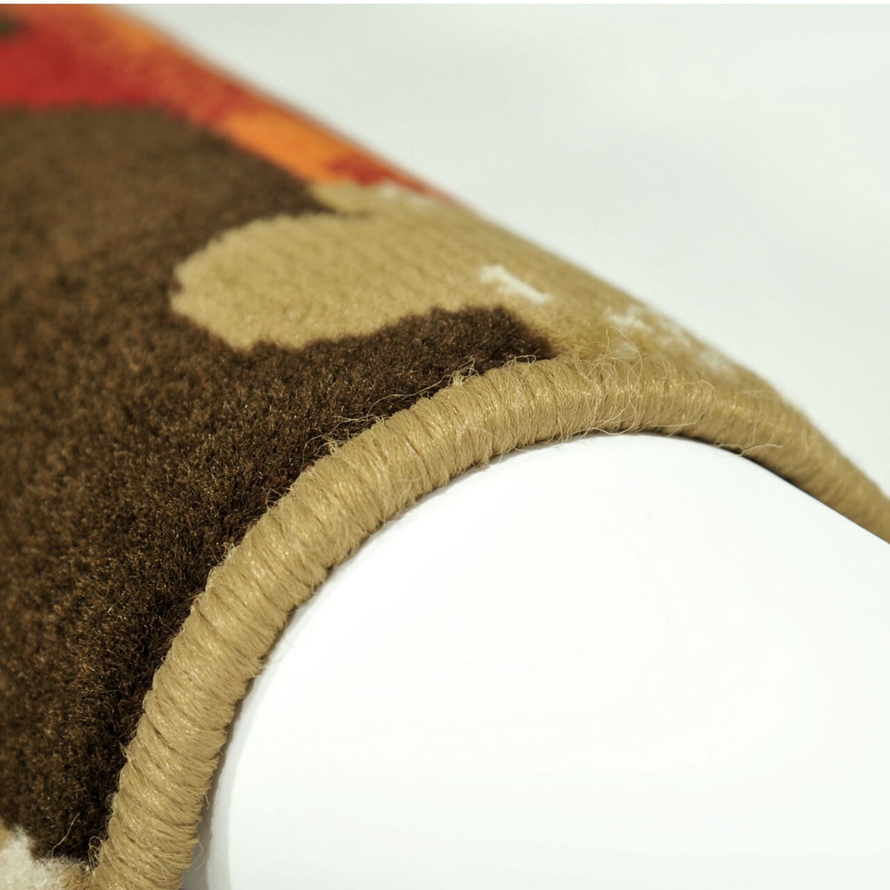 Prin compozitia sa din materiale rezistente si tesatura deasa cu firele de 7 mm, se face remarcat prin calitate si confort, fiind potrivit si pentru incaperile care beneficiaza de incalzire prin pardoseala. Florile rosii si portocalii, frunzele stilizate incadrate in chenare geometrice, in culori calde de rosu, portocaliu, maro, crem, denota dinamism, optimism si caldura. Acest produs va contribui la sporirea confortului in spatiul de locuit si va completa minunat designul interior prin culori si forme geometrice.