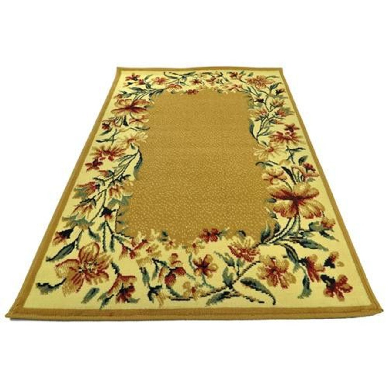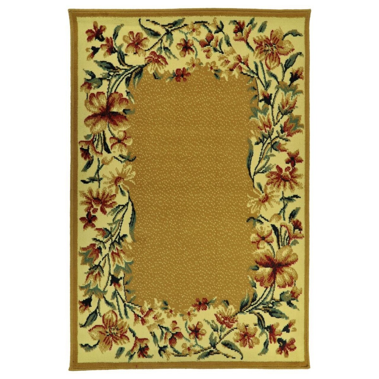 Este potrivit si pentru incaperile care beneficiaza de incalzire prin pardoseala. Florile prezente pe marginea covorului, de nuante rosii, ruginii, caramizii si bej, sunt dispuse ca un chenar, iar in mijloc apare un dreptunghi simplu maro deschis de efect. Va conferi confort si se va remarca prin durabilitate si anduranta.