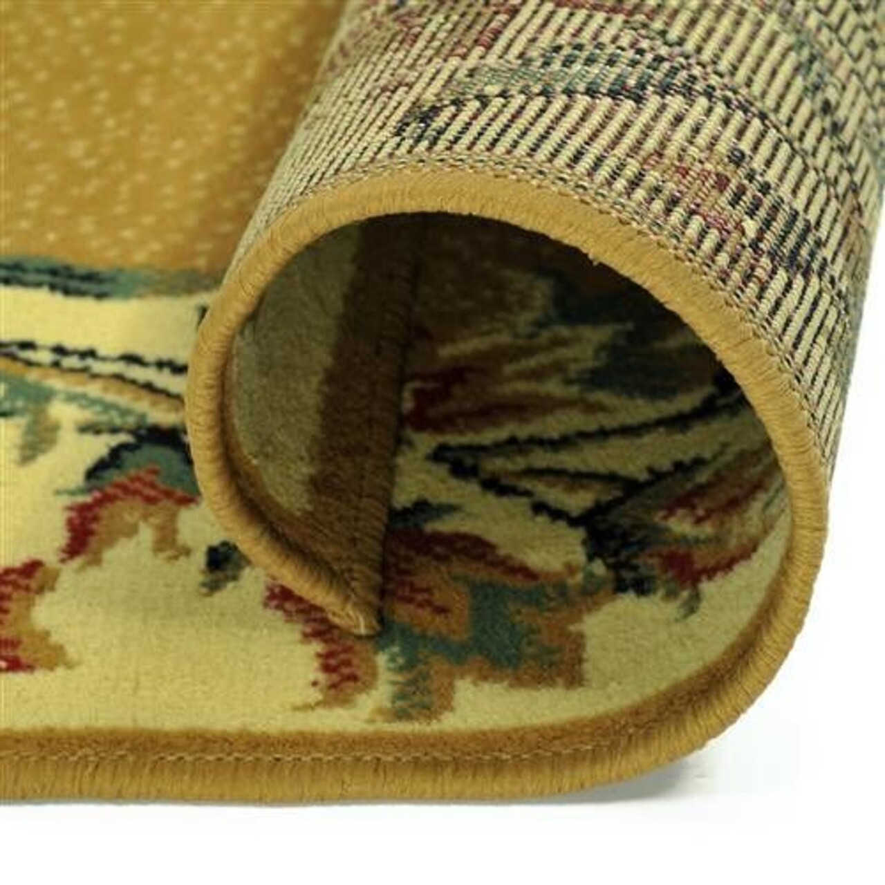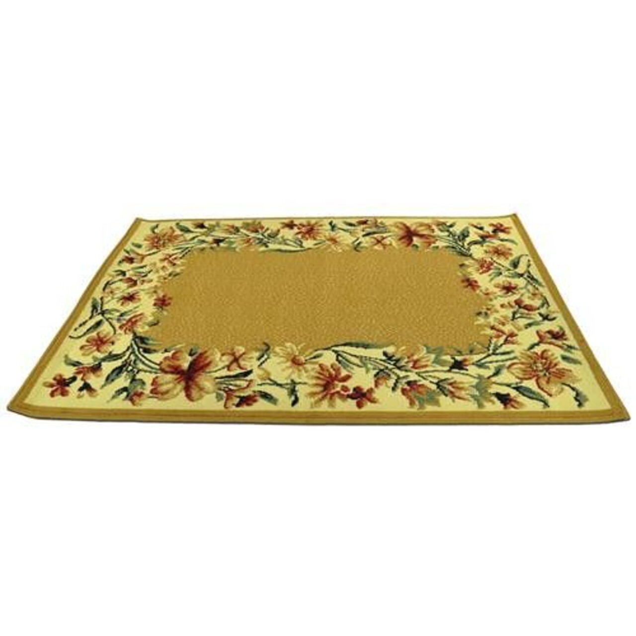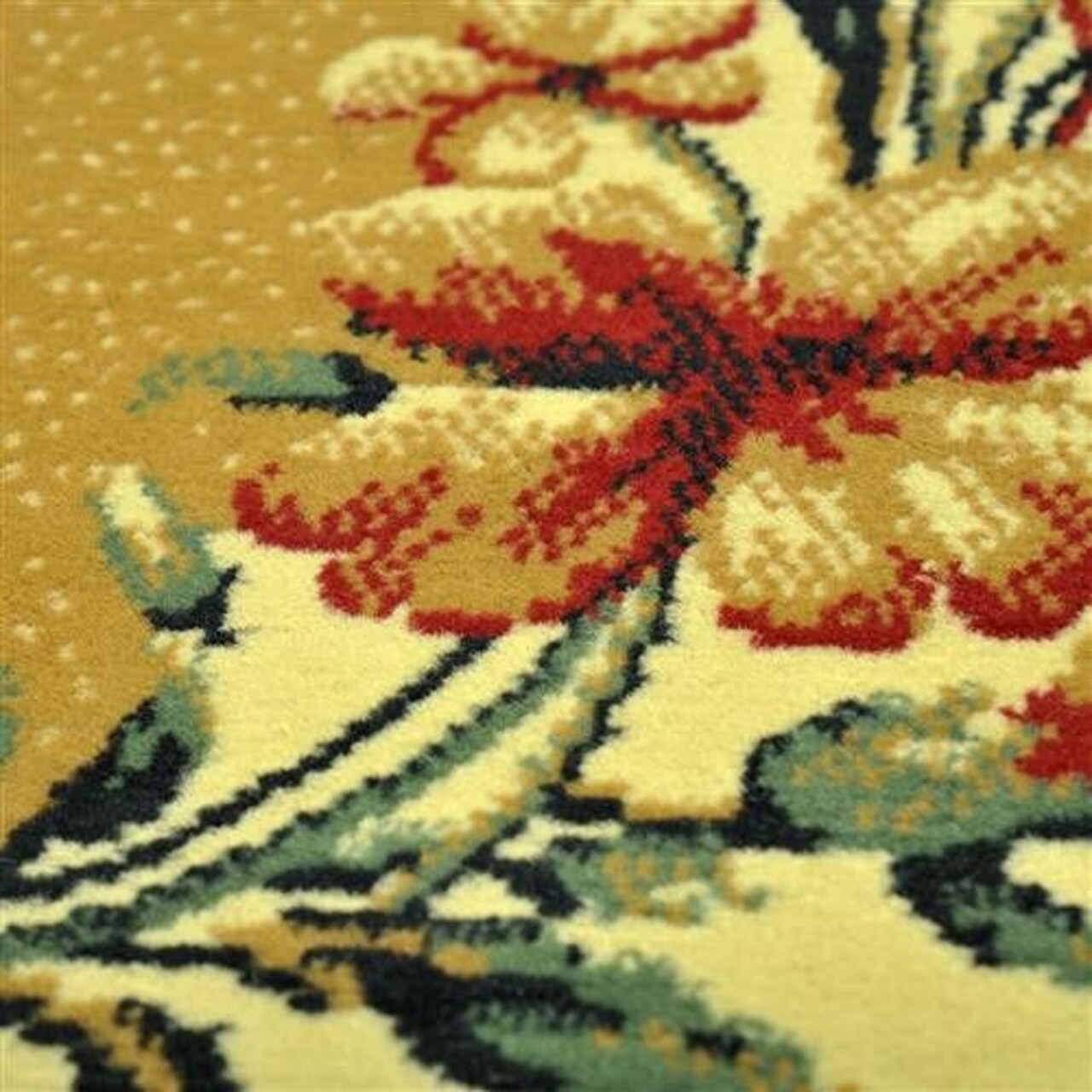 Este potrivit si pentru incaperile care beneficiaza de incalzire prin pardoseala. Florile prezente pe marginea covorului, de nuante rosii, ruginii, caramizii si bej, sunt dispuse ca un chenar, iar in mijloc apare un dreptunghi simplu maro deschis de efect. Va conferi confort si se va remarca prin durabilitate si anduranta.