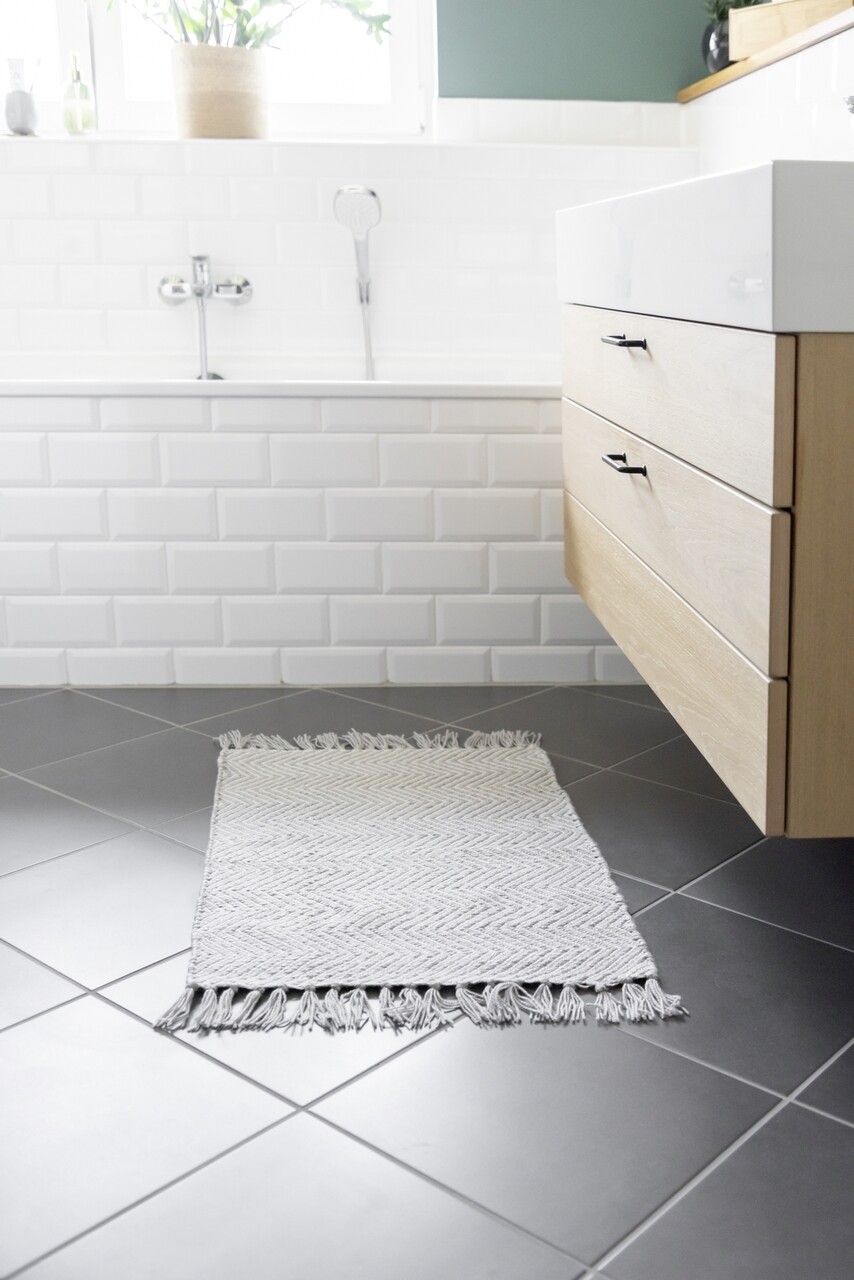 Covor in stil etno la moda realizat din cca. 18 sticle PET reciclate, 100% poliester. Spate anti-alunecare. Rezistent la incalzirea prin pardoseala. Se poate spala pana la 40°C. Greutate: 1350 g/m².