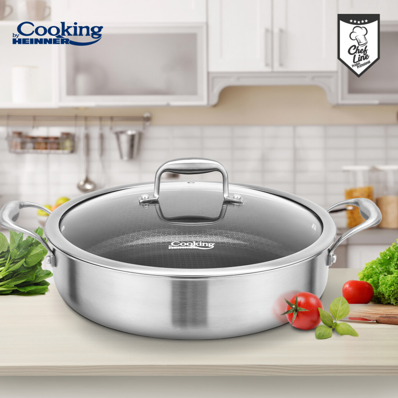 Vasele din inox Heinner au baza capsulata, astfel incat caldura sa fie distribuita uniform pe toata suprafata bazei, reducand considerabil consumul de energie si timpul de preparare. Capacul este prevazut cu o portiune perforata pentru a elimina aburii in timpul fierberii. Adaugand caracteristici precum acoperirea ceramica antiaderenta HONEYCOMB, cu protectie la zgarieturi, peretele in trei straturi (inox-aluminiu-inox) si baza cu inductie, face ca acest produs sa fie ideal pentru bucataria dumneavoastra.