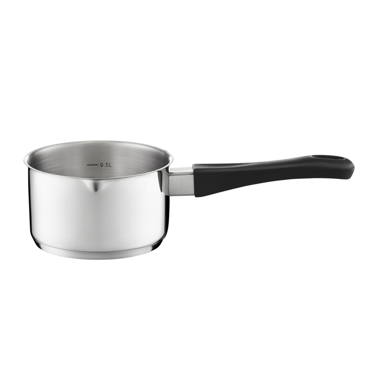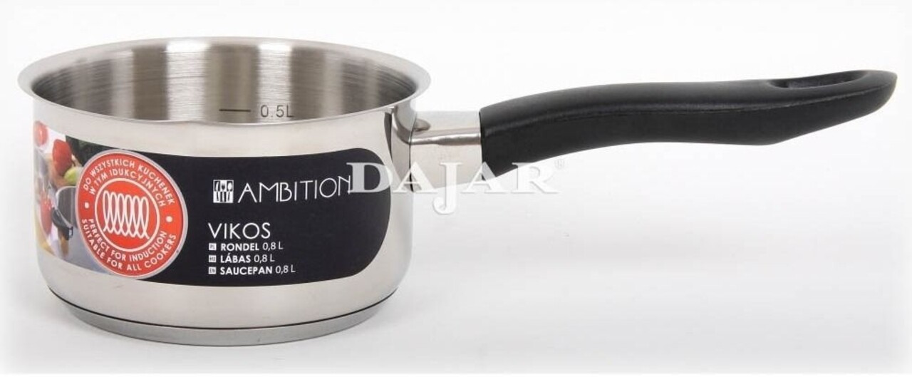 Cratita din otel inoxidabil, cu o capacitate de 800ml. Cu un aspect simplu insa modern, aceasta are un maner confortabil din bachelita, ce o face usor de manevrat. Mai mult, are si o scara de masurare practica pe interior. Cratita poate fi folosita pentru toate tipurile de aragaze, inclusiv cele cu inductie, si se poate curata cu usurinta in masina de spalat vase.