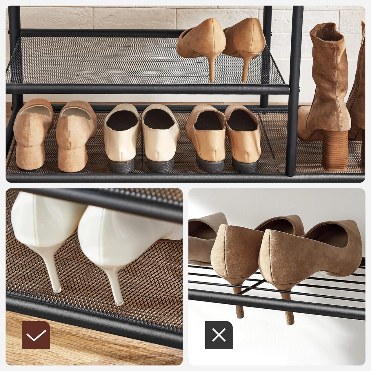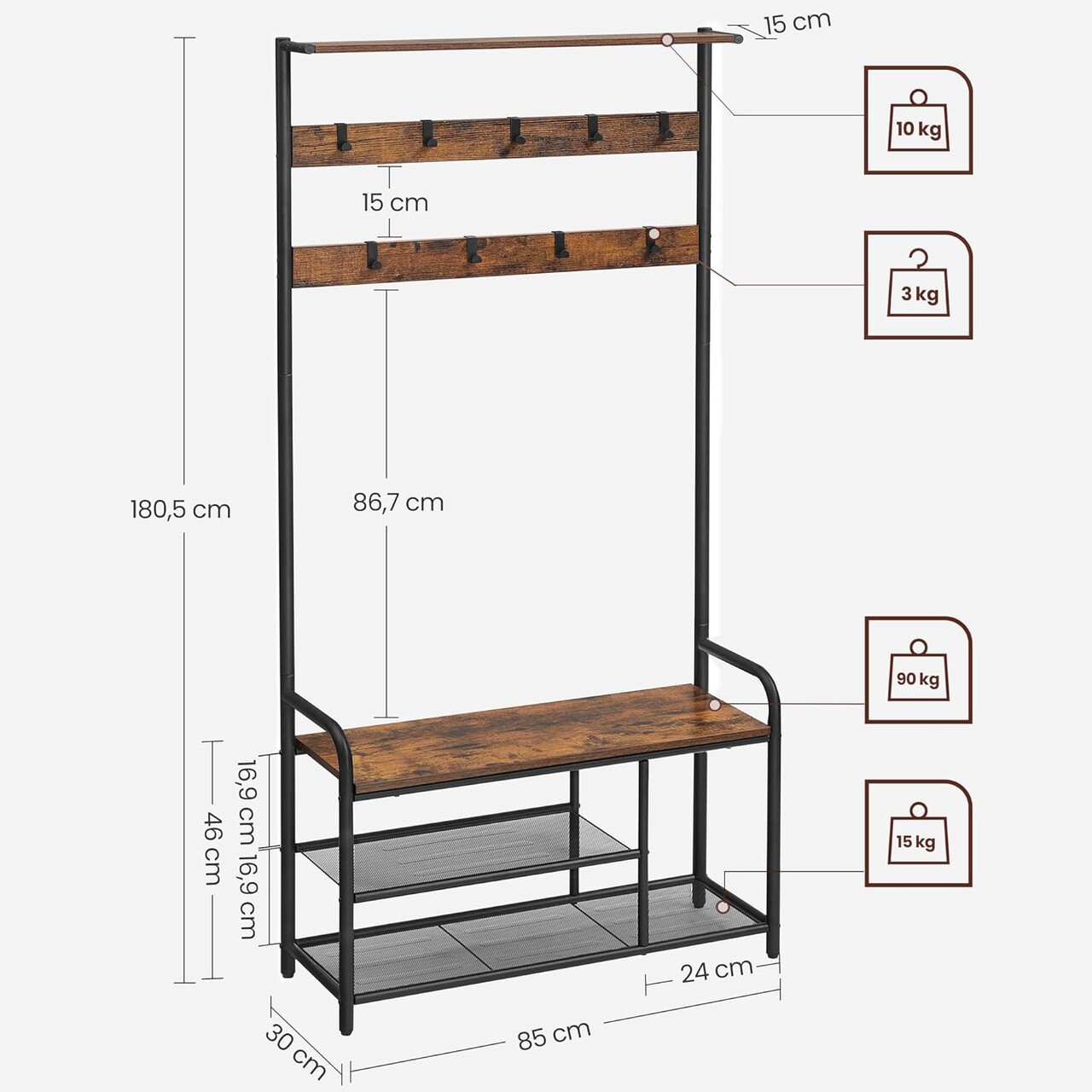 Cuier cu bancheta si pantofar Industrial, Vasagle, 85x30x180.5 cm, PAL/otel, maro rustic