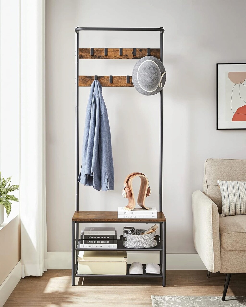 Cuier cu bancheta si pantofar Vasagle, 64x32.2x180 cm, PAL/otel/poliester, maro rustic