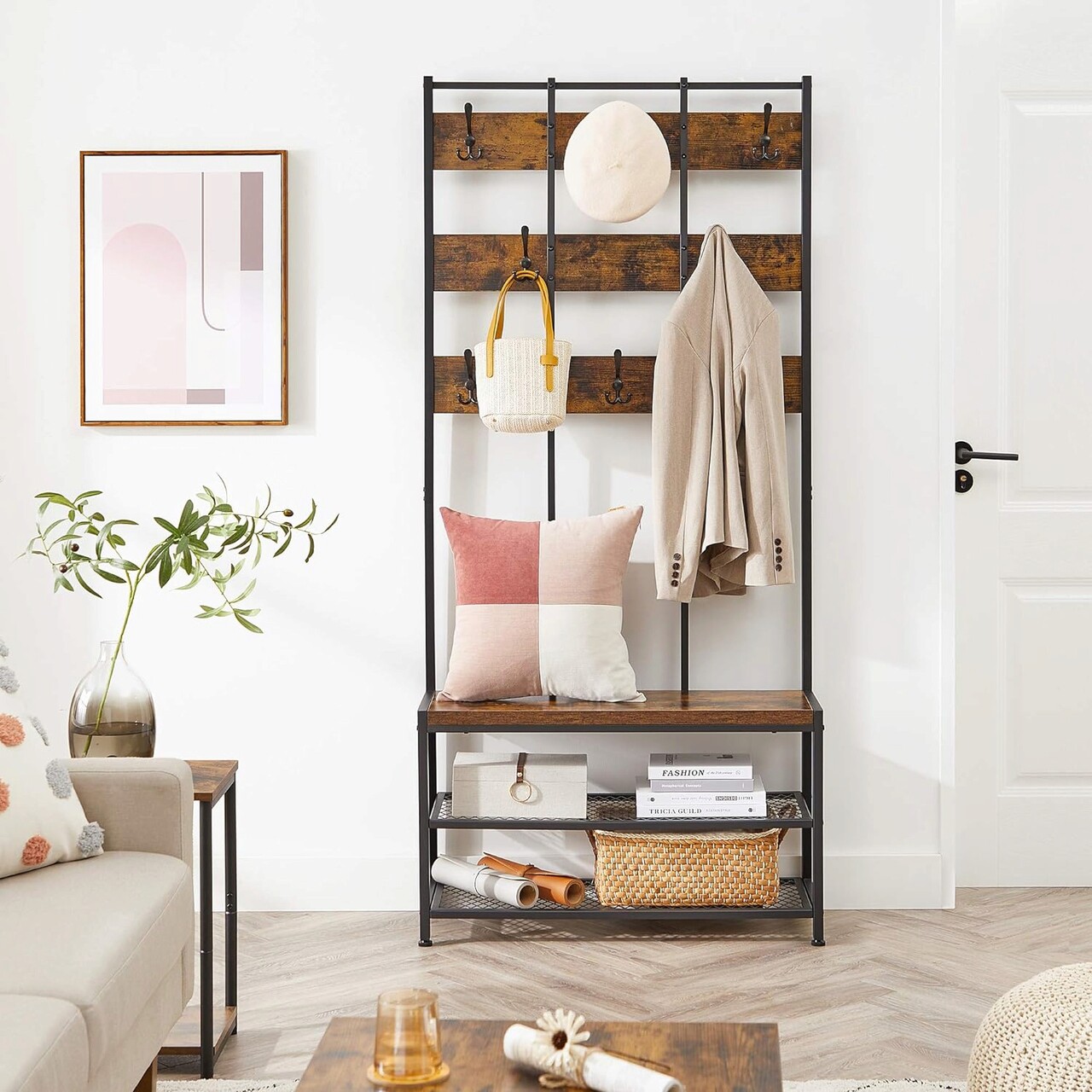 Cuier cu bancheta si pantofar Vasagle, 84 x 30 x 182 cm, PAL/otel, maro antic
