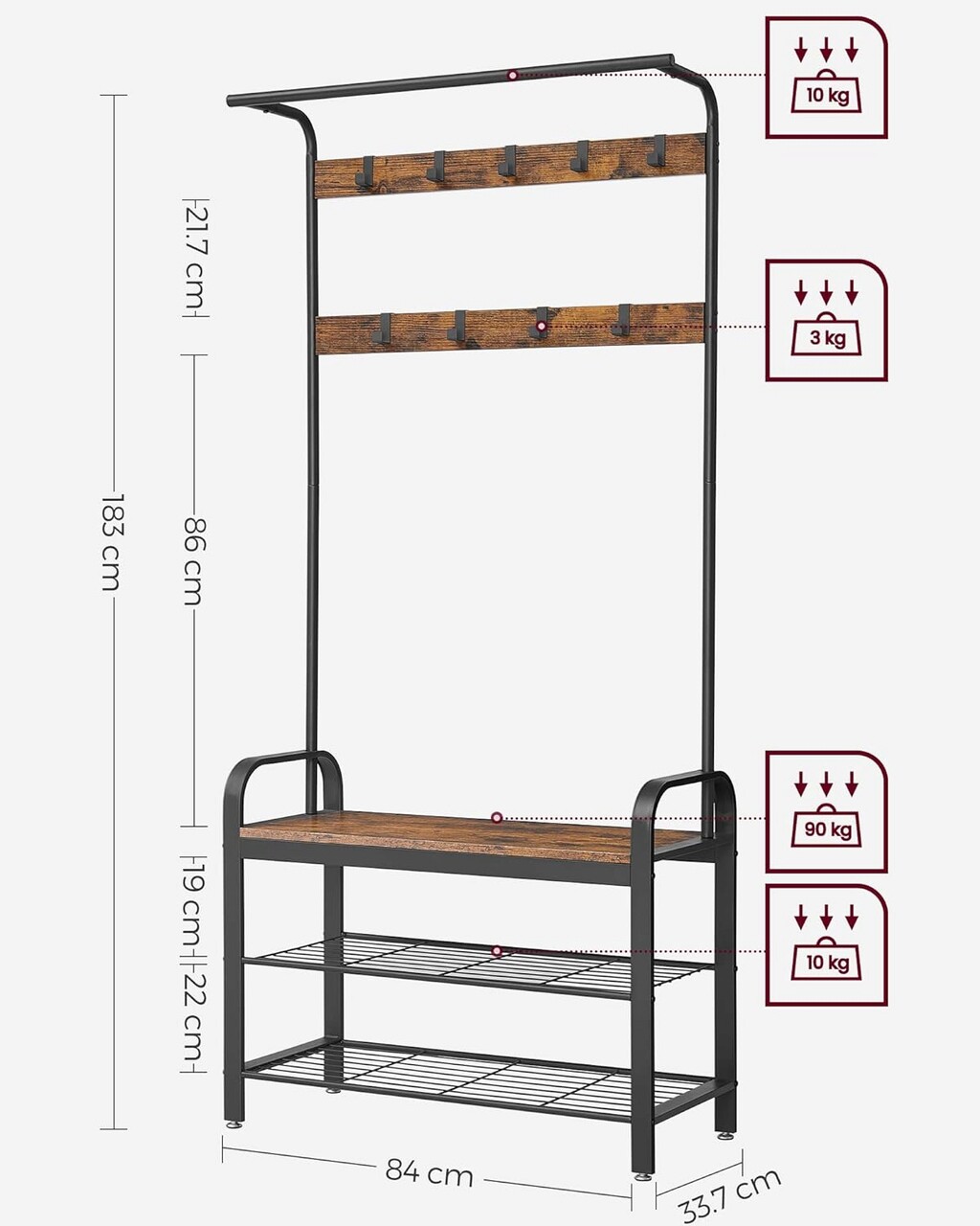Cuier cu bancheta si pantofar Vasagle, 84 x 33.7 x 183 cm, PAL/fier, maro rustic