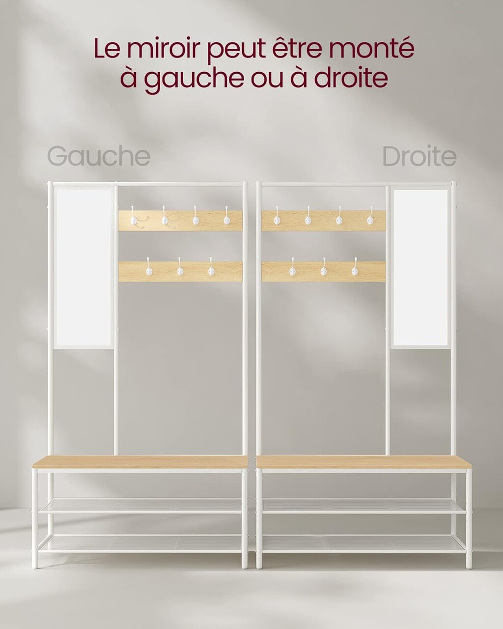 Cuier cu oglinda, bancheta si pantofar Modern Style, Vasagle, 98x35x180 cm, PAL/otel, alb/natural