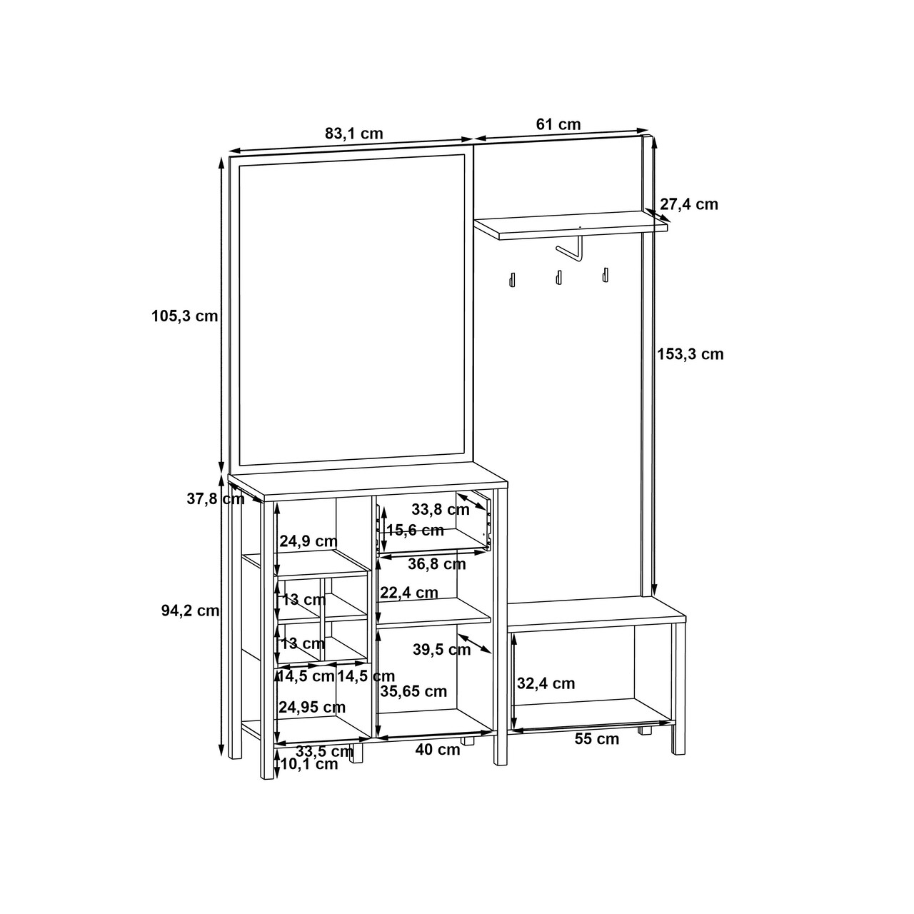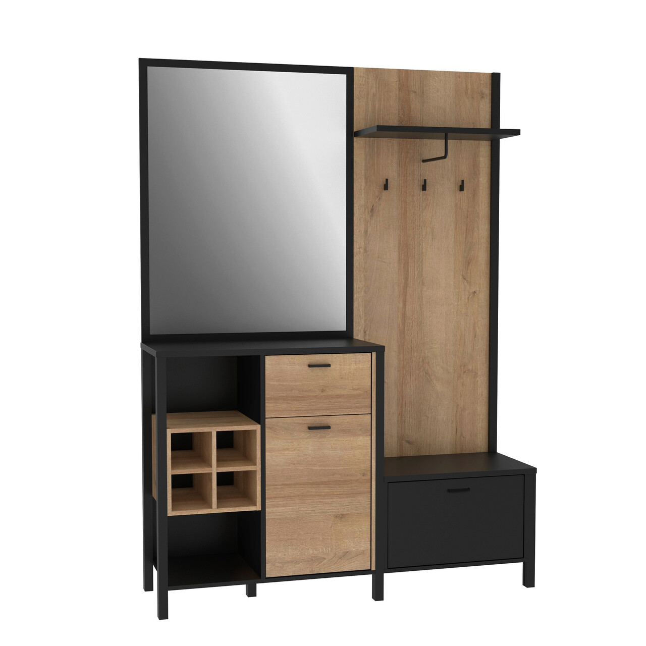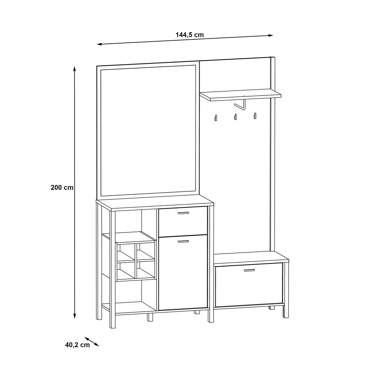 Cuier cu pantofar Heusden, Bedora, 144.5x40.2x200 cm, PAL/metal, negru/stejar