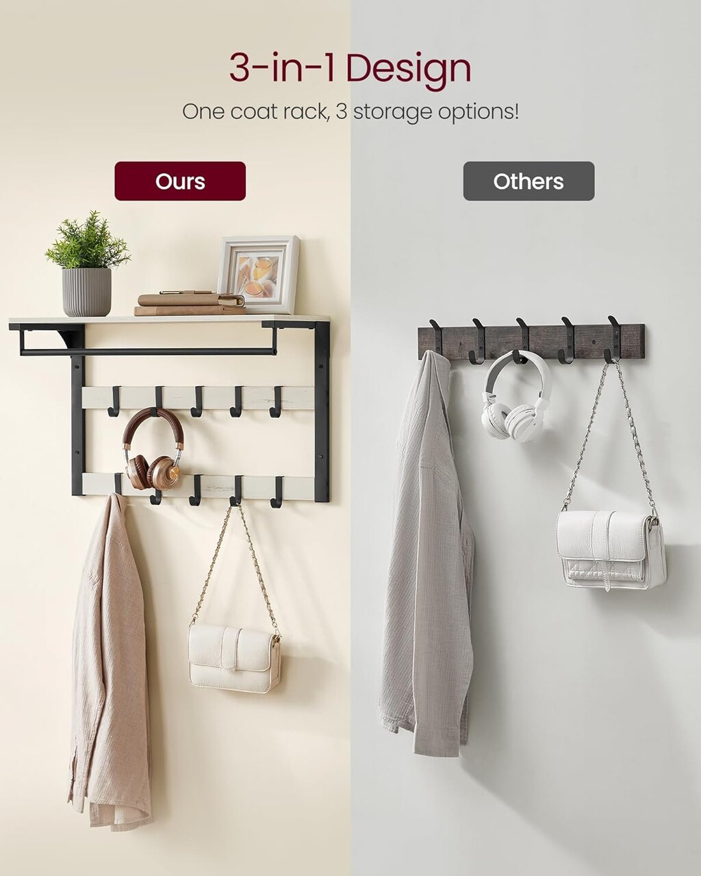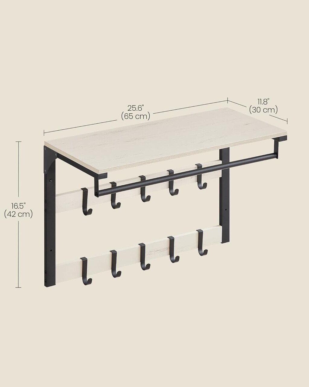 Cuier cu raft si 10 agatatori metalice, Vasagle, 65x30x42 cm, PAL/otel, alb rustic/negru