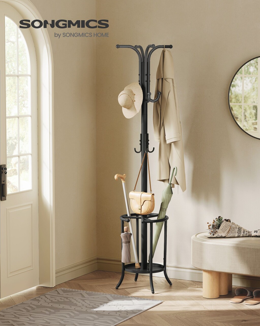 Cuier cu suport de umbrele Tree, Songmics, 40x40x175 cm, max 15 kg. otel, negru