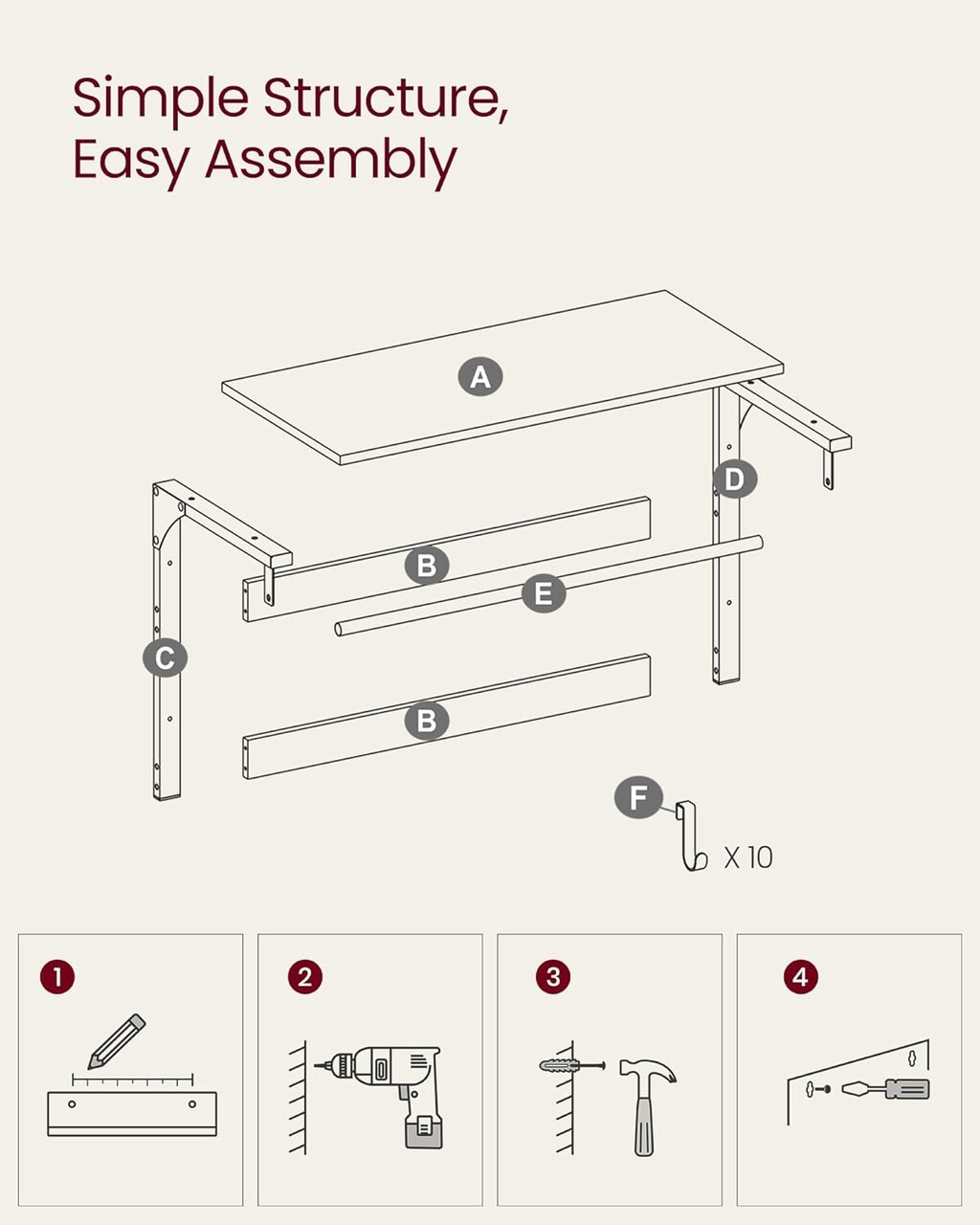 Capacitate mare de incarcare: Fabricat din otel si PAL, raftul suporta 20 kg, fiecare carlig 5 kg, iar bara pentru umerase pana la 15 kg.