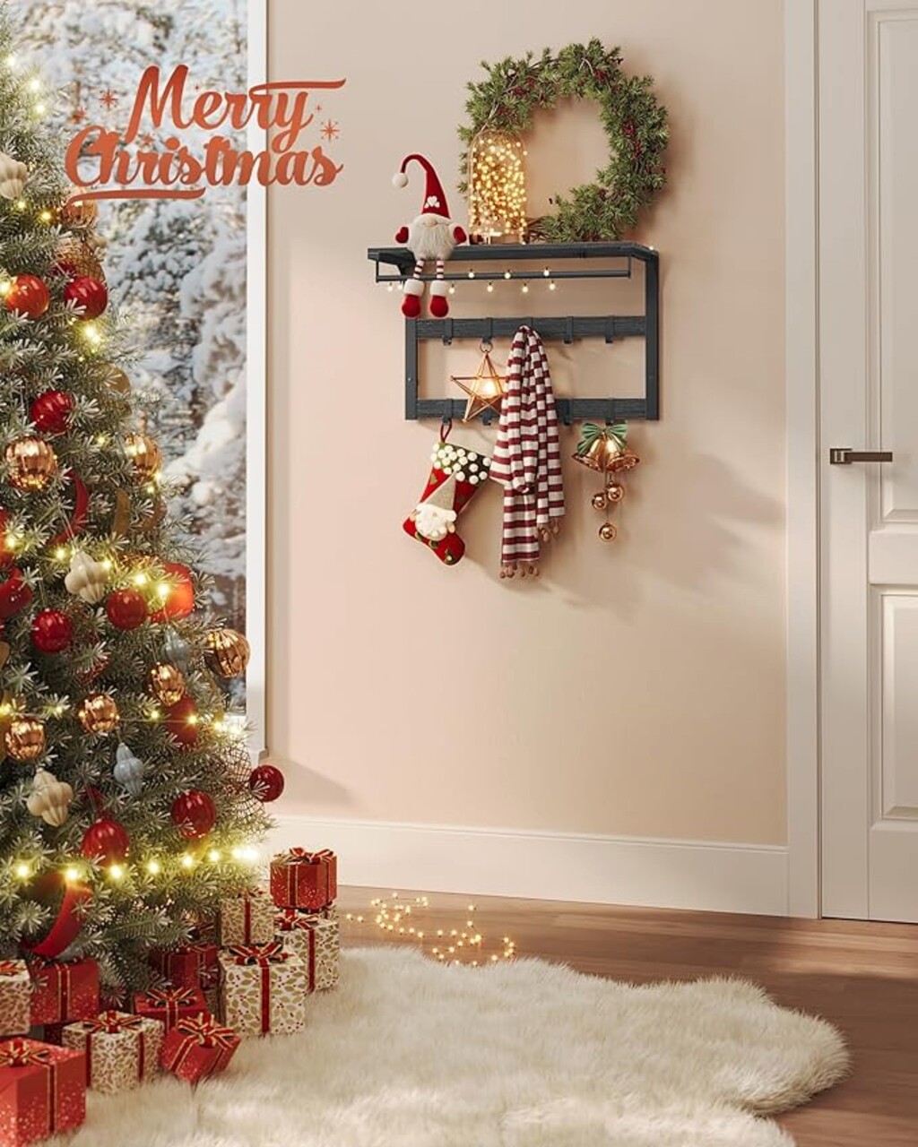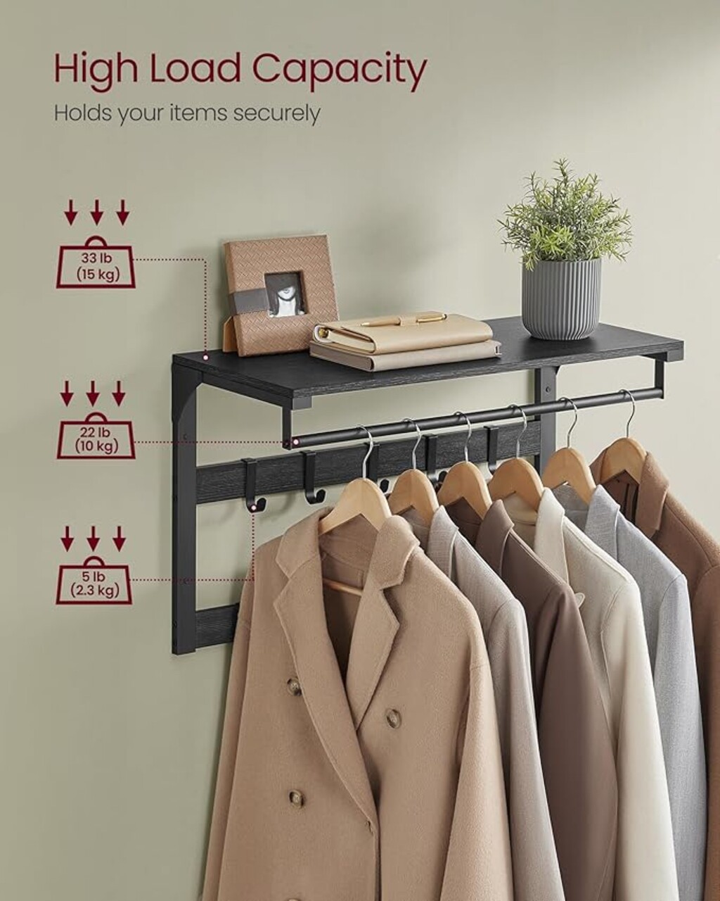 Acest cuier de perete include un raft pentru expunere, o bara pentru umerase si 10 carlige detasabile - ideal pentru hol, dormitor sau baie.