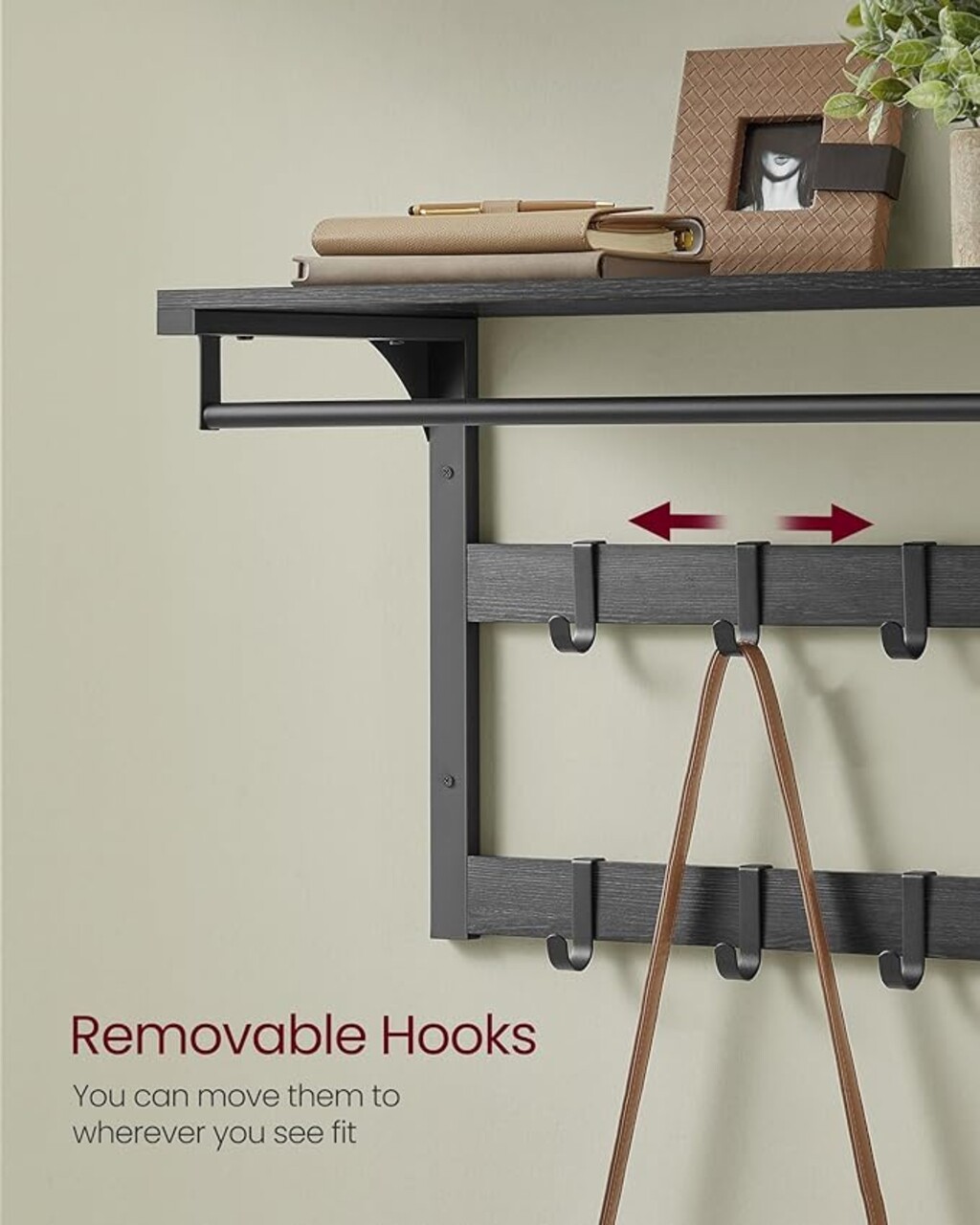 Cuier de perete cu 10 agatatori, Vasagle, 66x30x42 cm, PAL/otel, gri carbune/negru