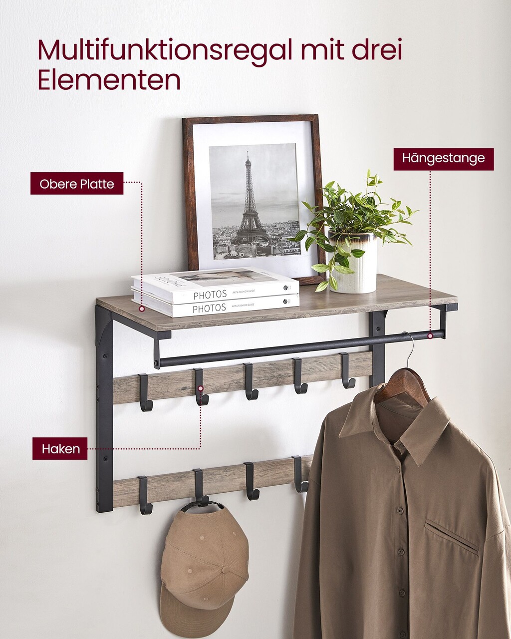 Cuier de perete, Vasagle, cu 10 agatatori, 65x30x42 cm, PAL/otel, gri/negru