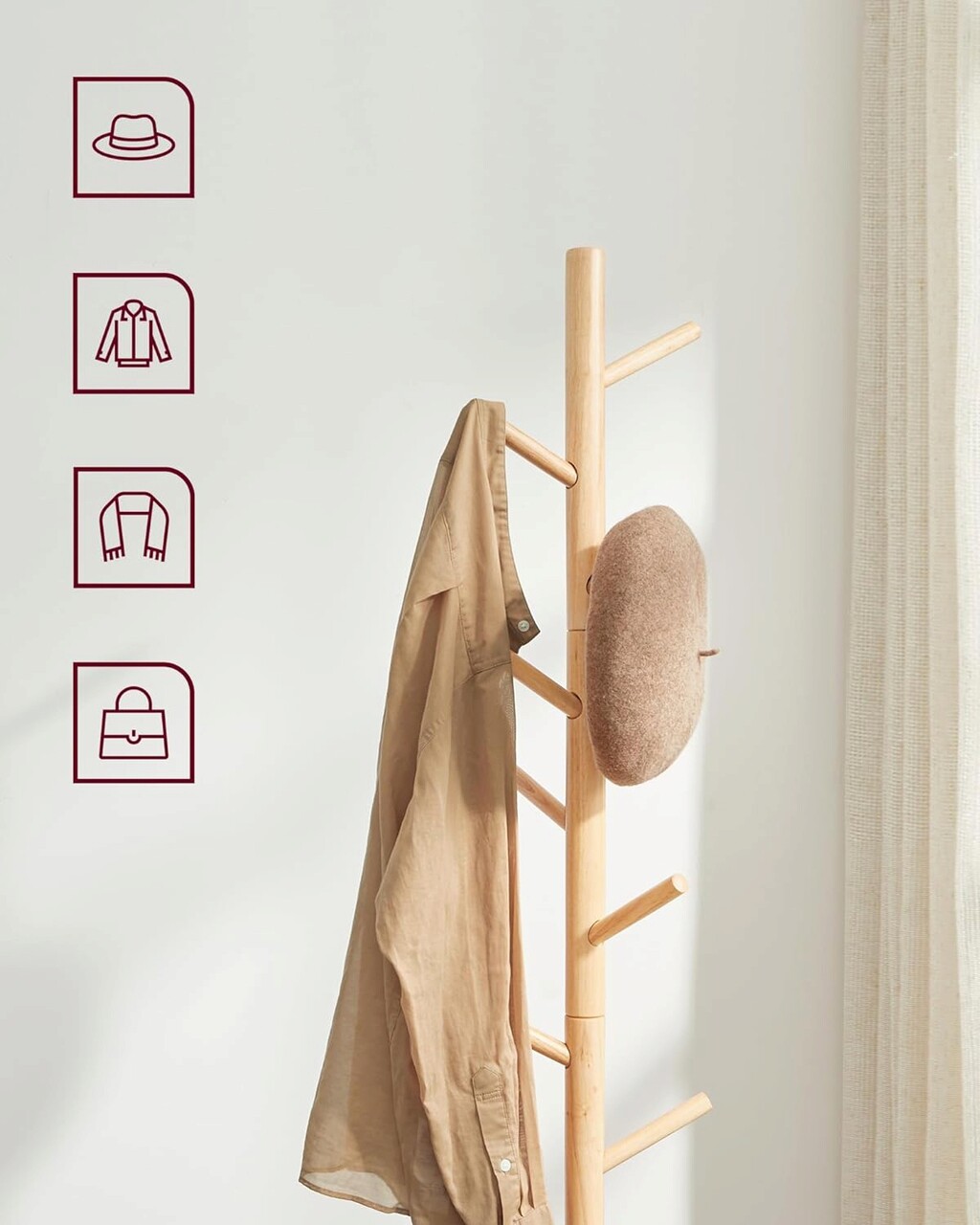 Durabil si revigorant: Fabricat din lemn masiv din arbore de cauciuc cu diametrul de 3,8 cm, acest cuier este durabil pentru multi ani. In plus, culoarea naturala adauga o nota revigoranta casei dvs.