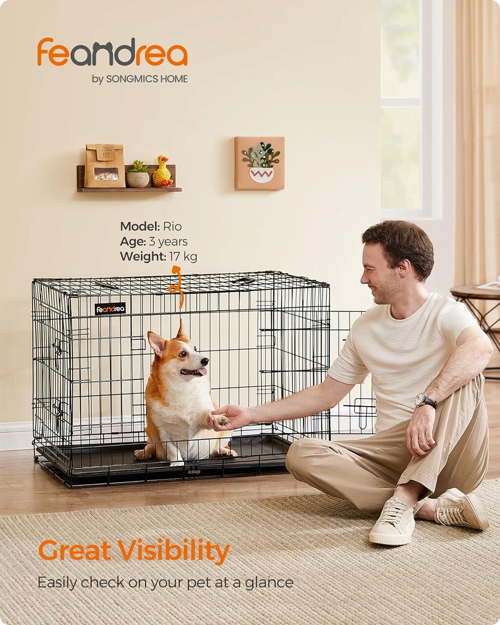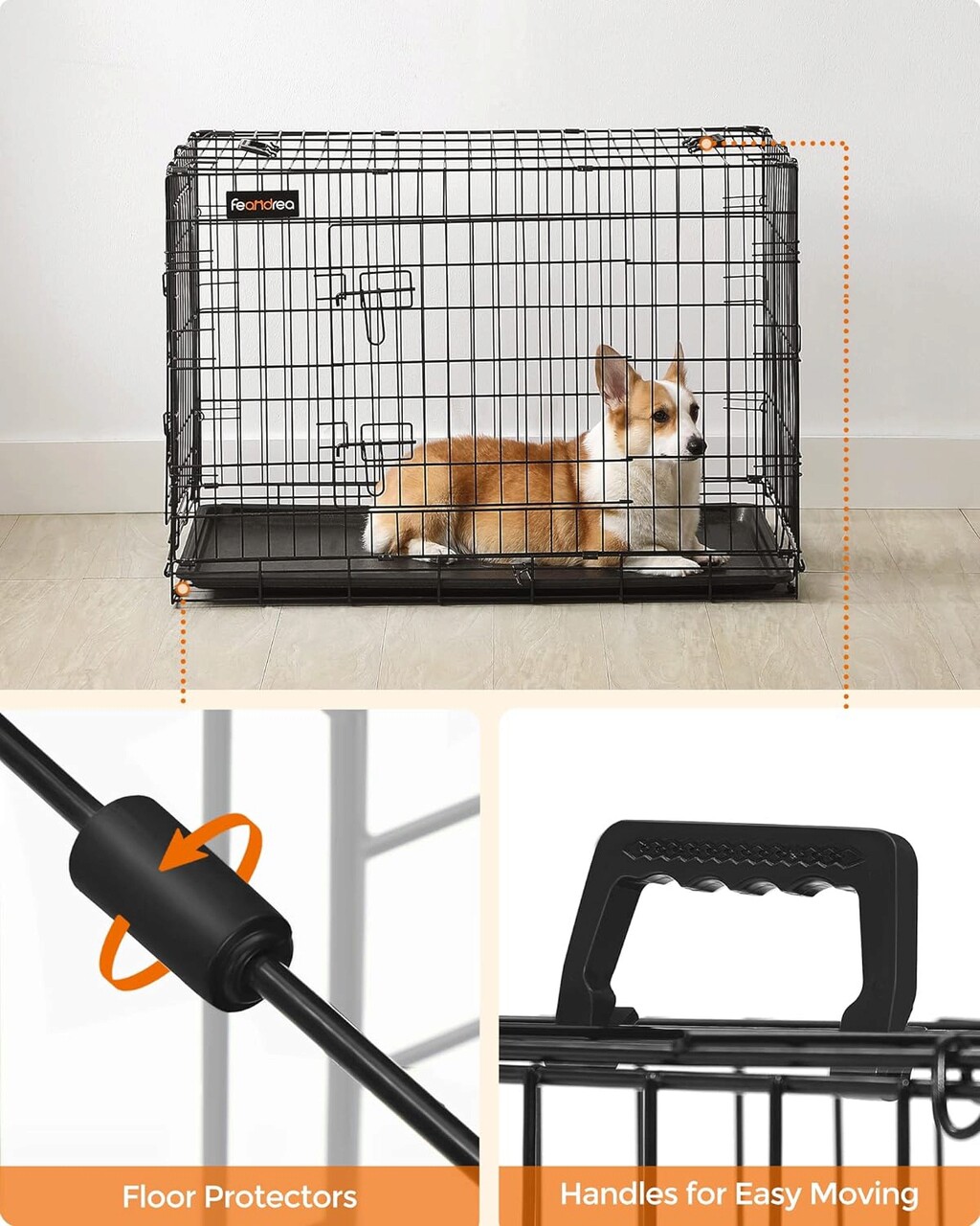 Cusca pentru caini cu 2 usi, Feandrea, pliabila, marimea L, max 18-32 kg, 92.5x57.5x64 cm, fier, negru