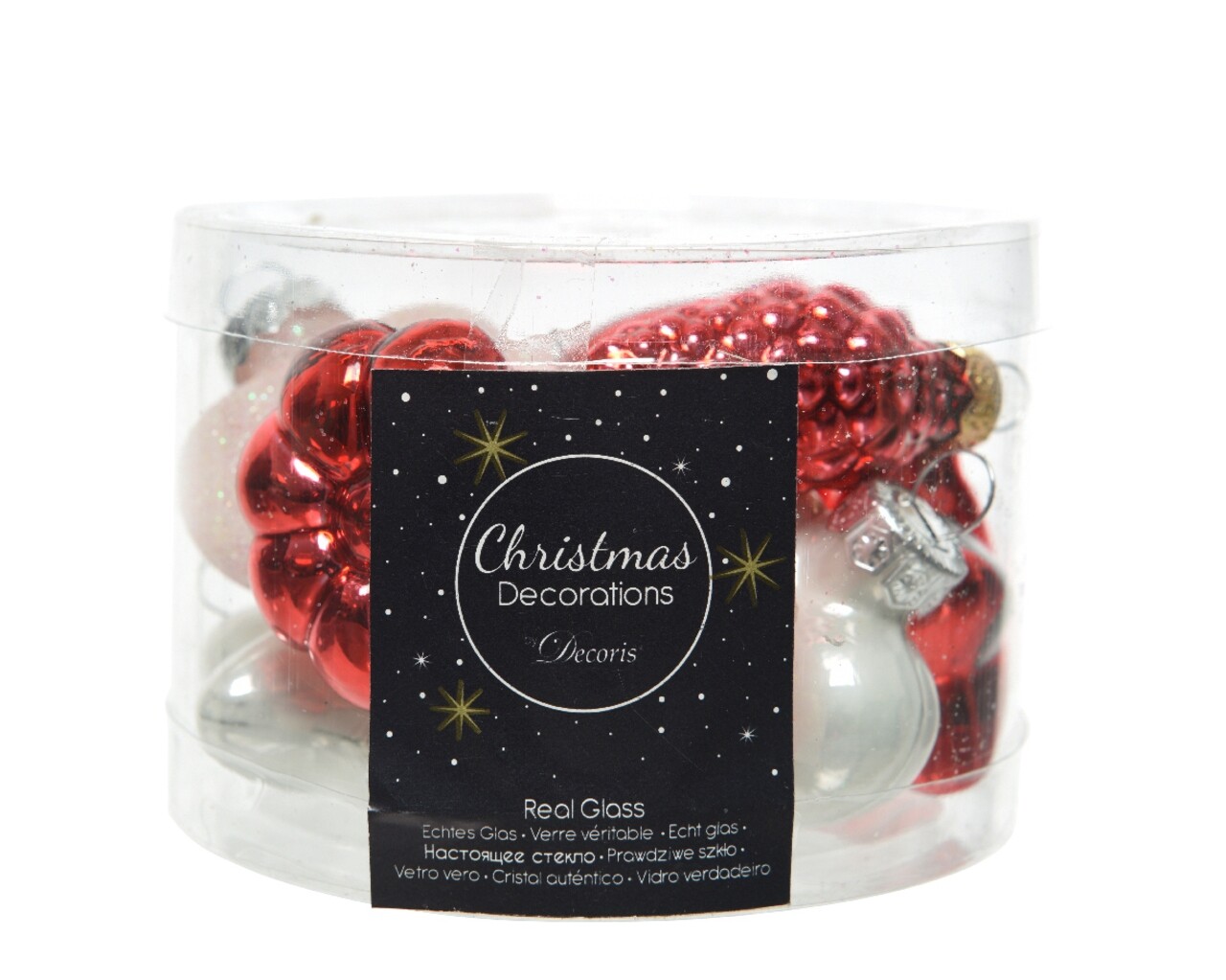 Cutie cu 12 globuri asortate, Decoris, sticla, alb/rosu