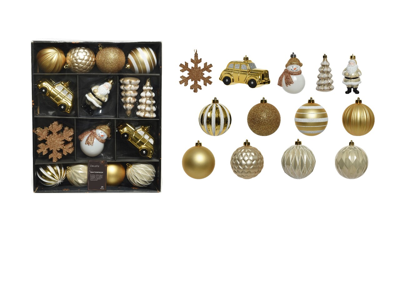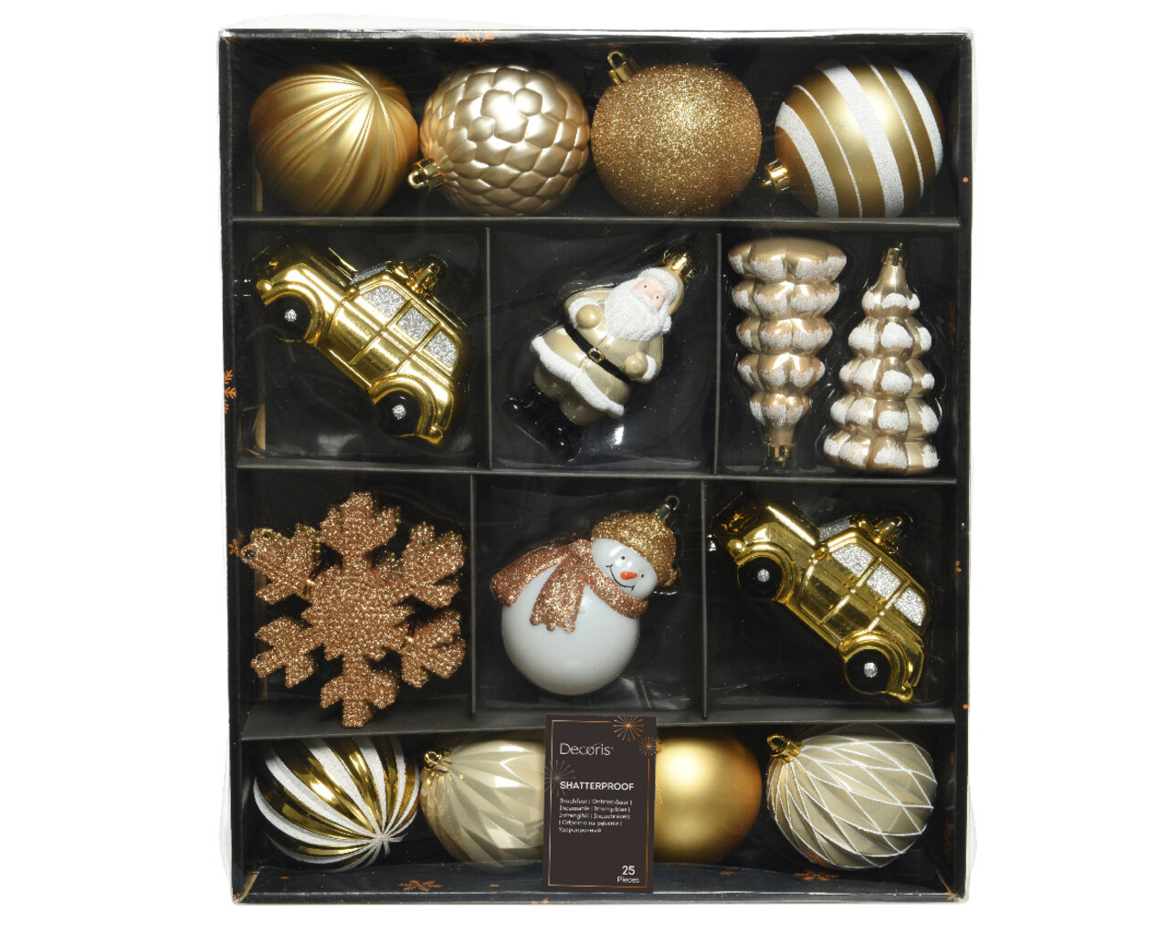 Cutie cu 25 de globuri, Decoris, plastic, alb/auriu/cupru