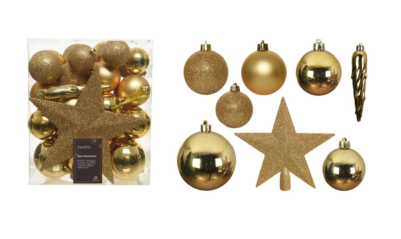 Cutie cu 33 globuri asortate si varf de brad Star, Decoris, plastic, auriu