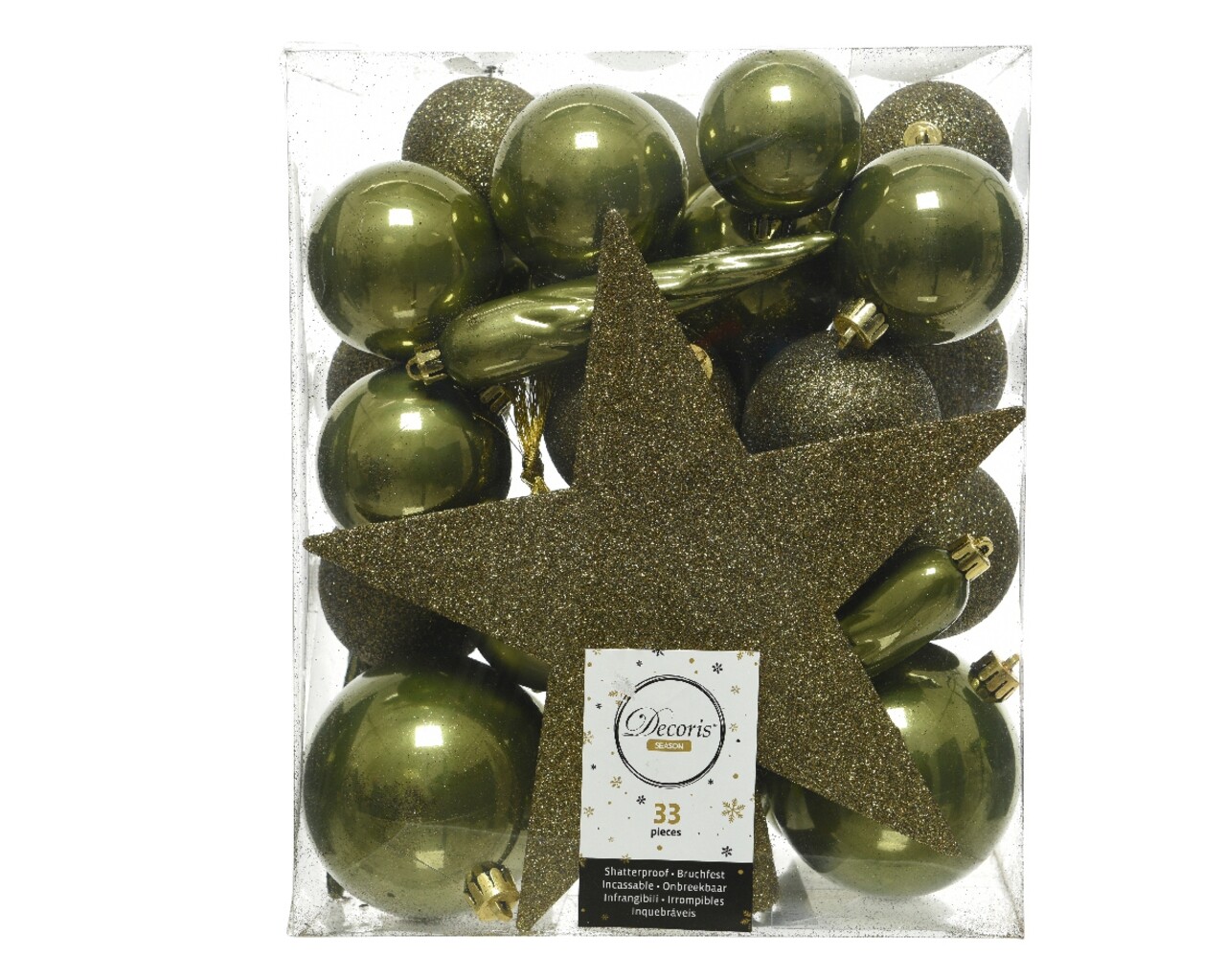 Cutie cu 33 globuri asortate si varf de brad Star Moss Green, Decoris, plastic, kaki