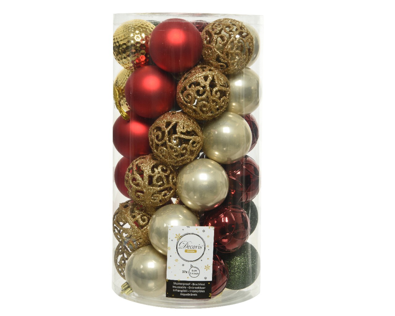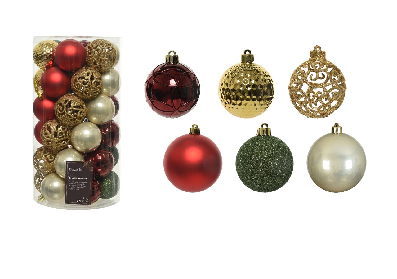 Cutie cu 37 globuri asortate Mix, Decoris, plastic, rosu/auriu/verde