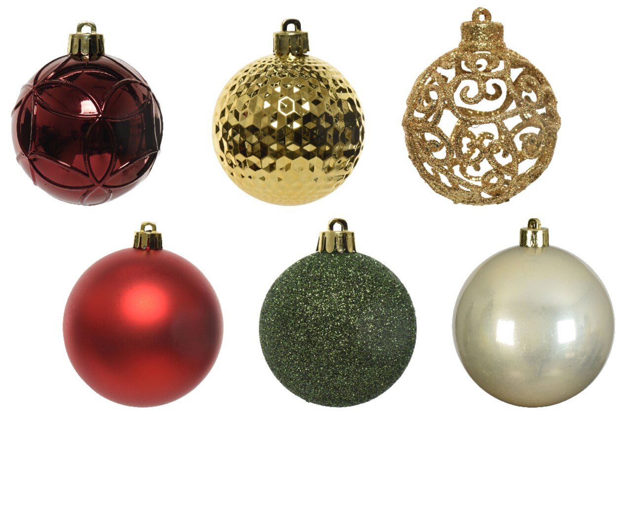 37 de globuri cu Ø6 cm (7 globuri simple, 6 globuri mate, 12 globuri cu sclipici, 6 globuri tip mingie de golf si 6 globuri cu model cu cercuri)