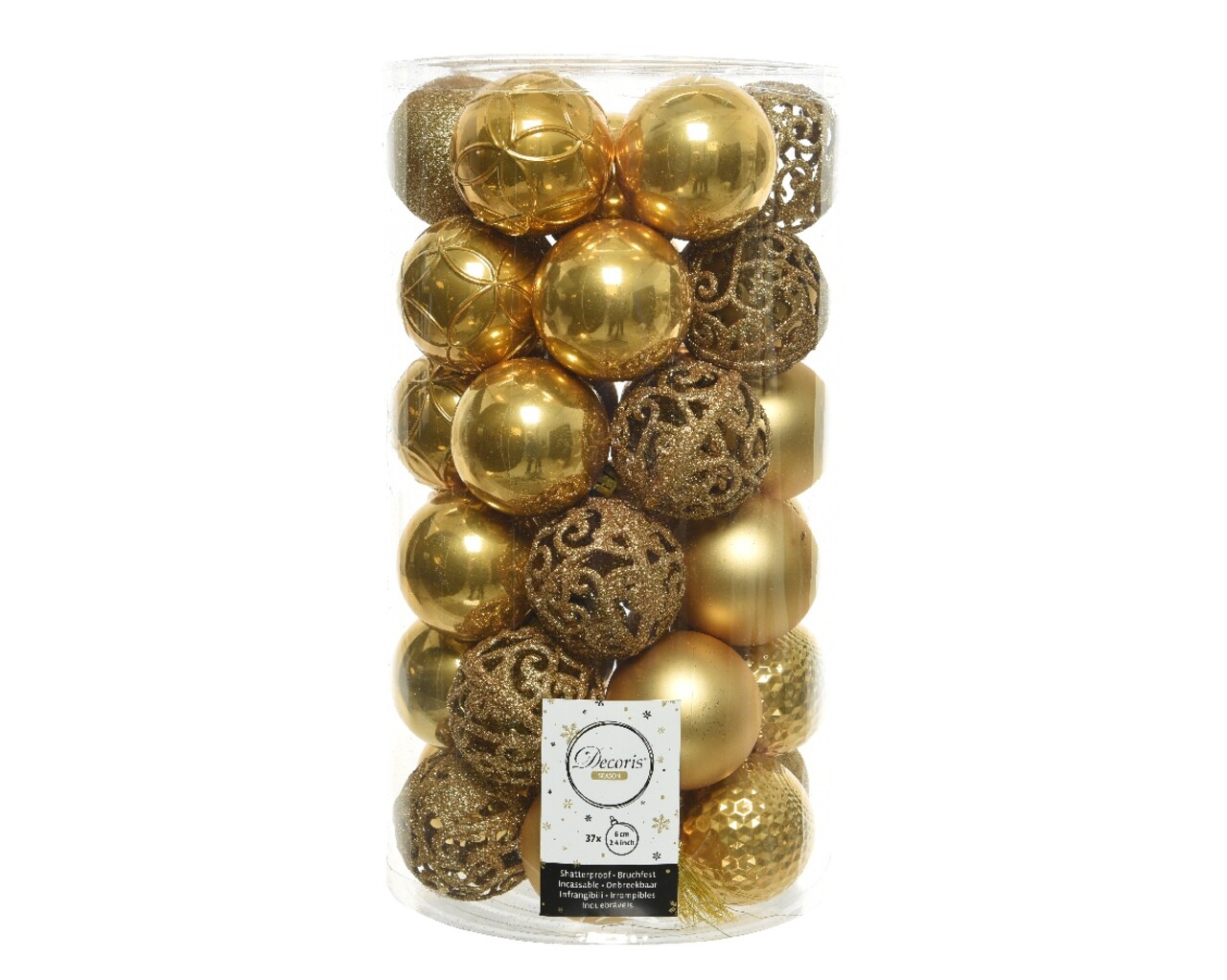 34 de globuri cu diametru de 6 cm (7 globuri simple, 6 globuri mate, 12 globuri cu sclipici, 6 globuri tip mingie de golf si 6 globuri cu model cu cercuri)