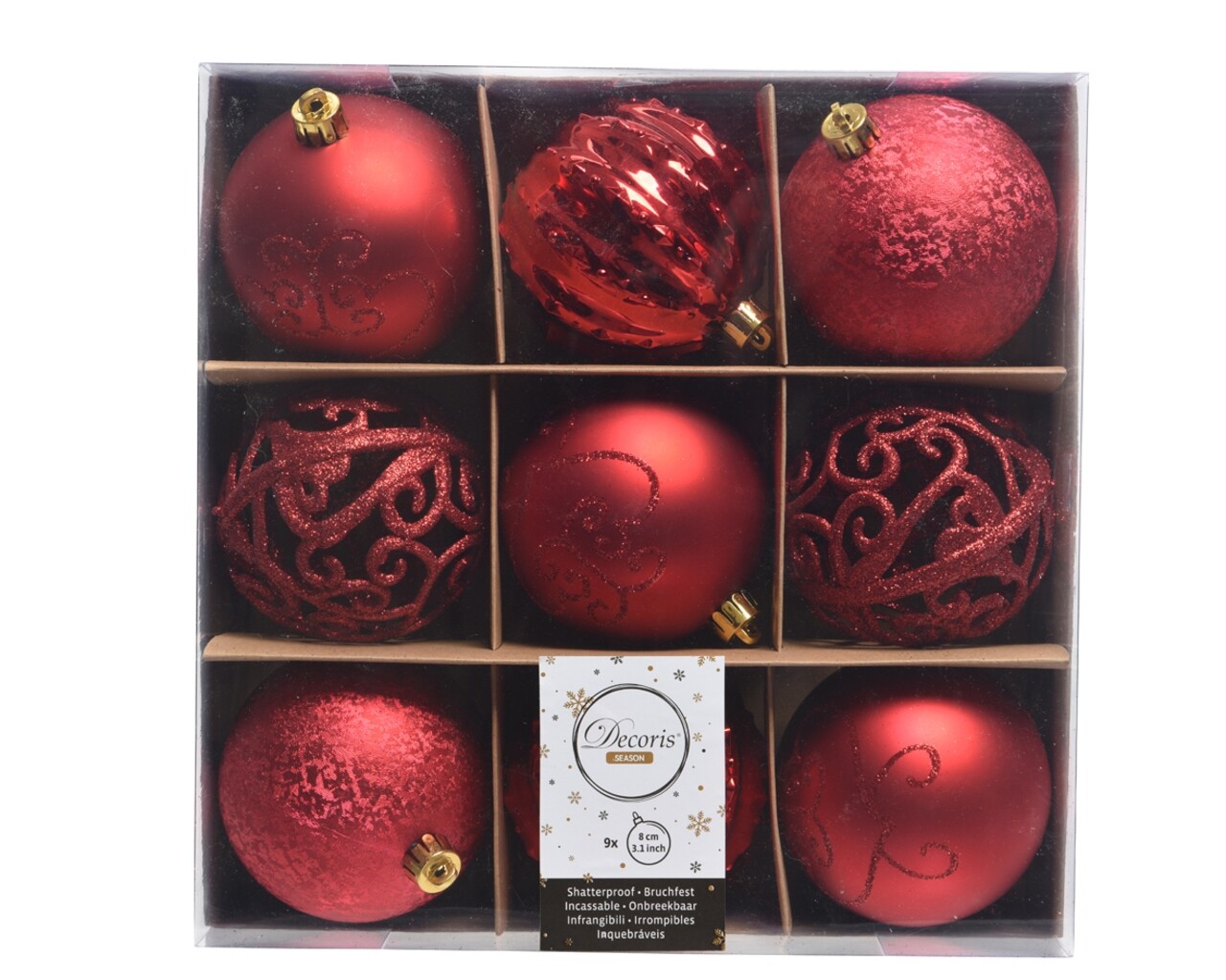 Cutie cu 9 globuri asortate, Decoris, plastic, rosu