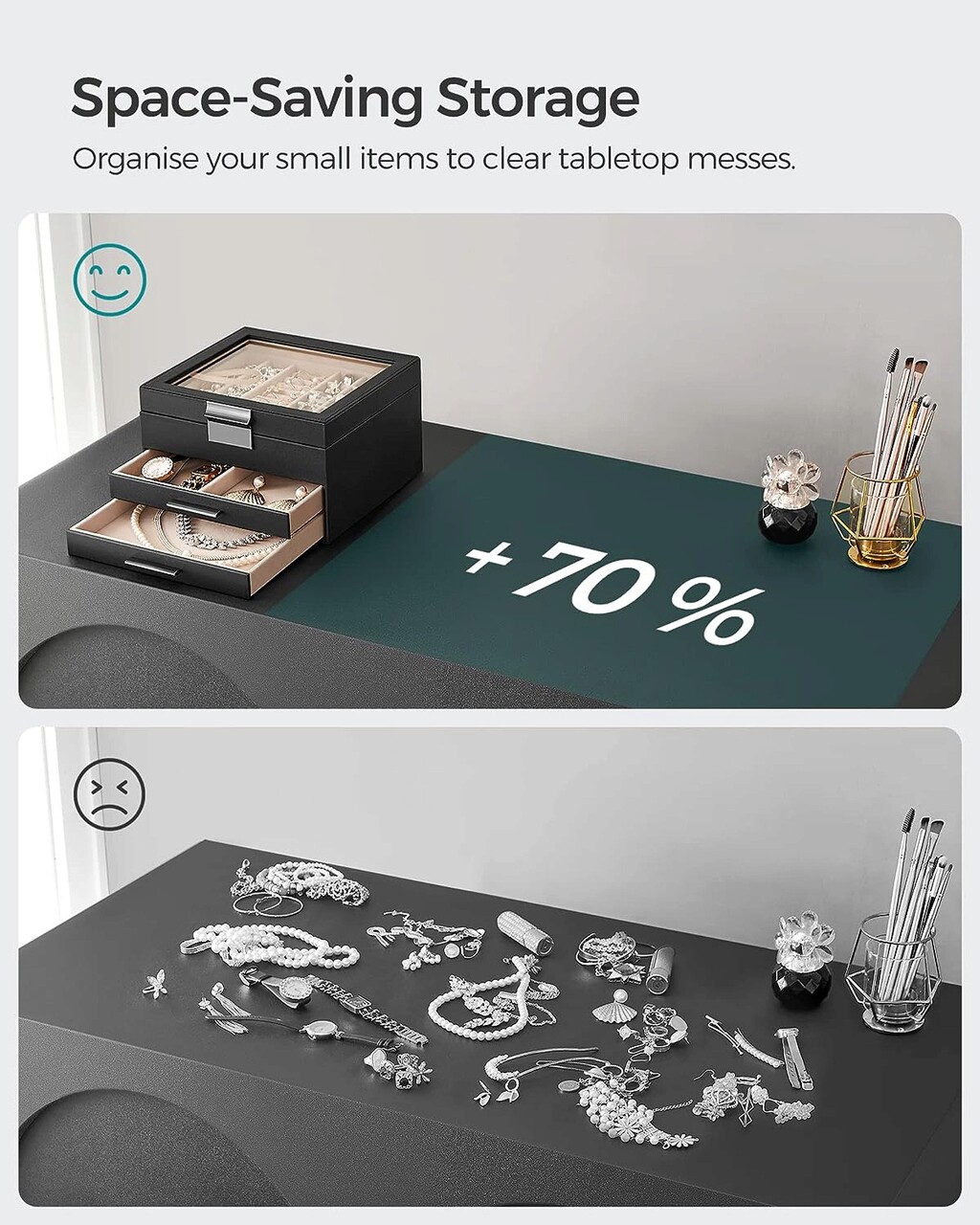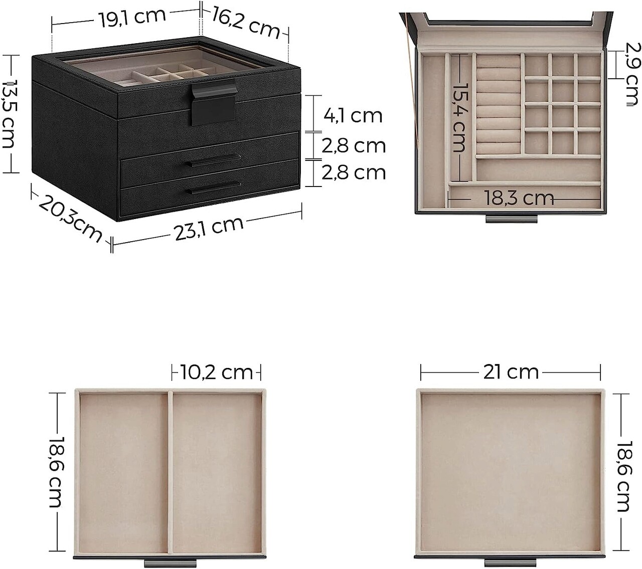 Cu cele 3 niveluri si 19 compartimente de diferite dimensiuni - aceasta cutie de bijuterii va ofera spatiu generos de depozitare pentru a va organiza bijuteriile.