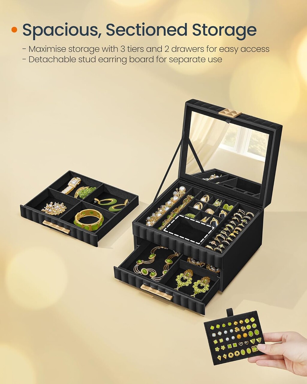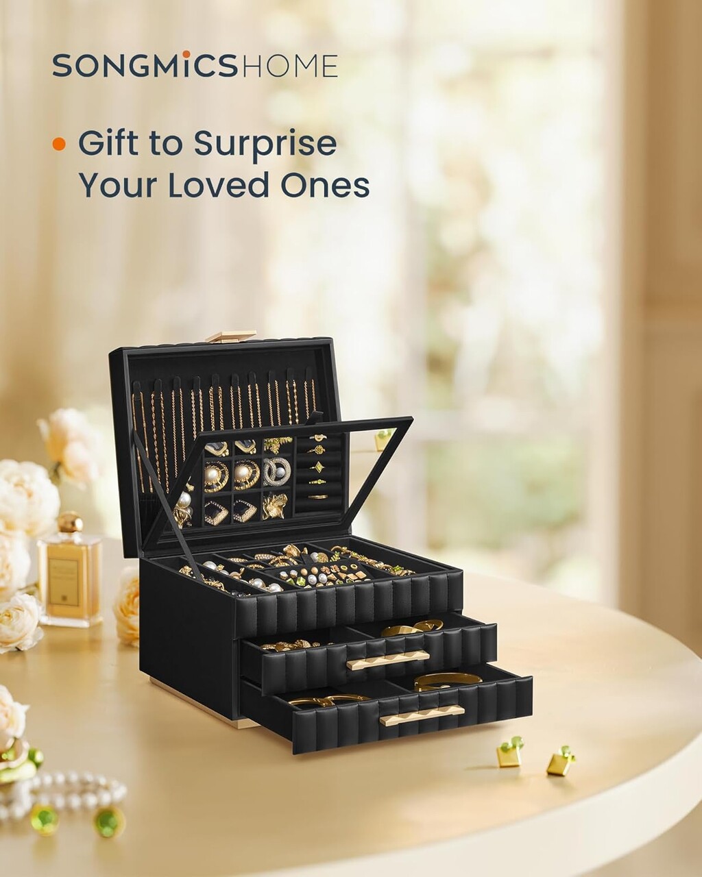 Cutie de bijuterii cu 3 etaje si oglinda, Songmics, 24x21.5x15.8 cm, MDF/piele ecologica, negru