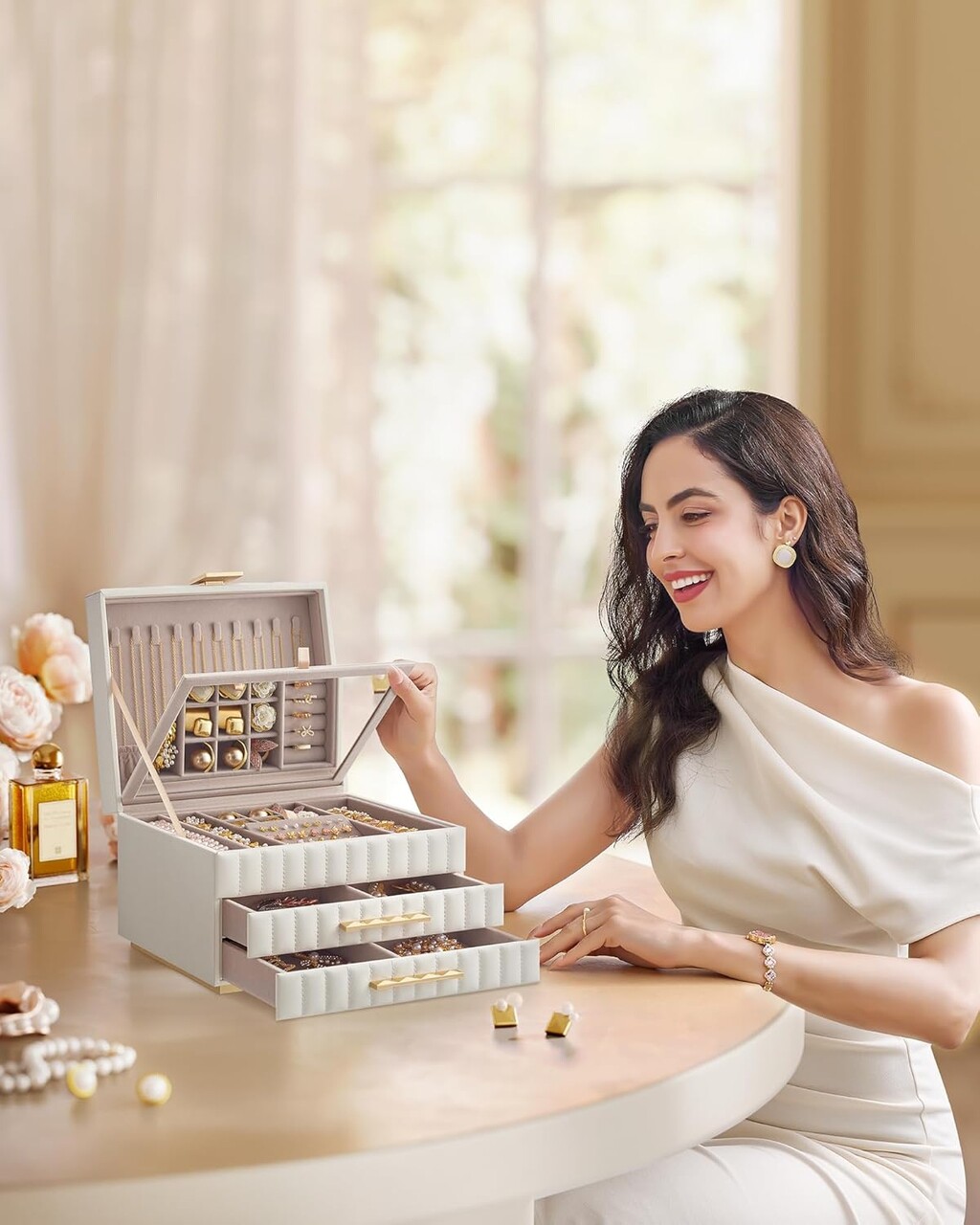 Spatiu mare de depozitare Capacul acestei cutii de bijuterii cu 3 niveluri ofera spatiu pentru pana la 10 coliere, in timp ce tava superioara si cele 2 sertare sunt proiectate cu compartimente separate pentru a va pastra cerceii, inelele si bratarile aranjate ordonat si fara riscul de a se incurca intre ele.
