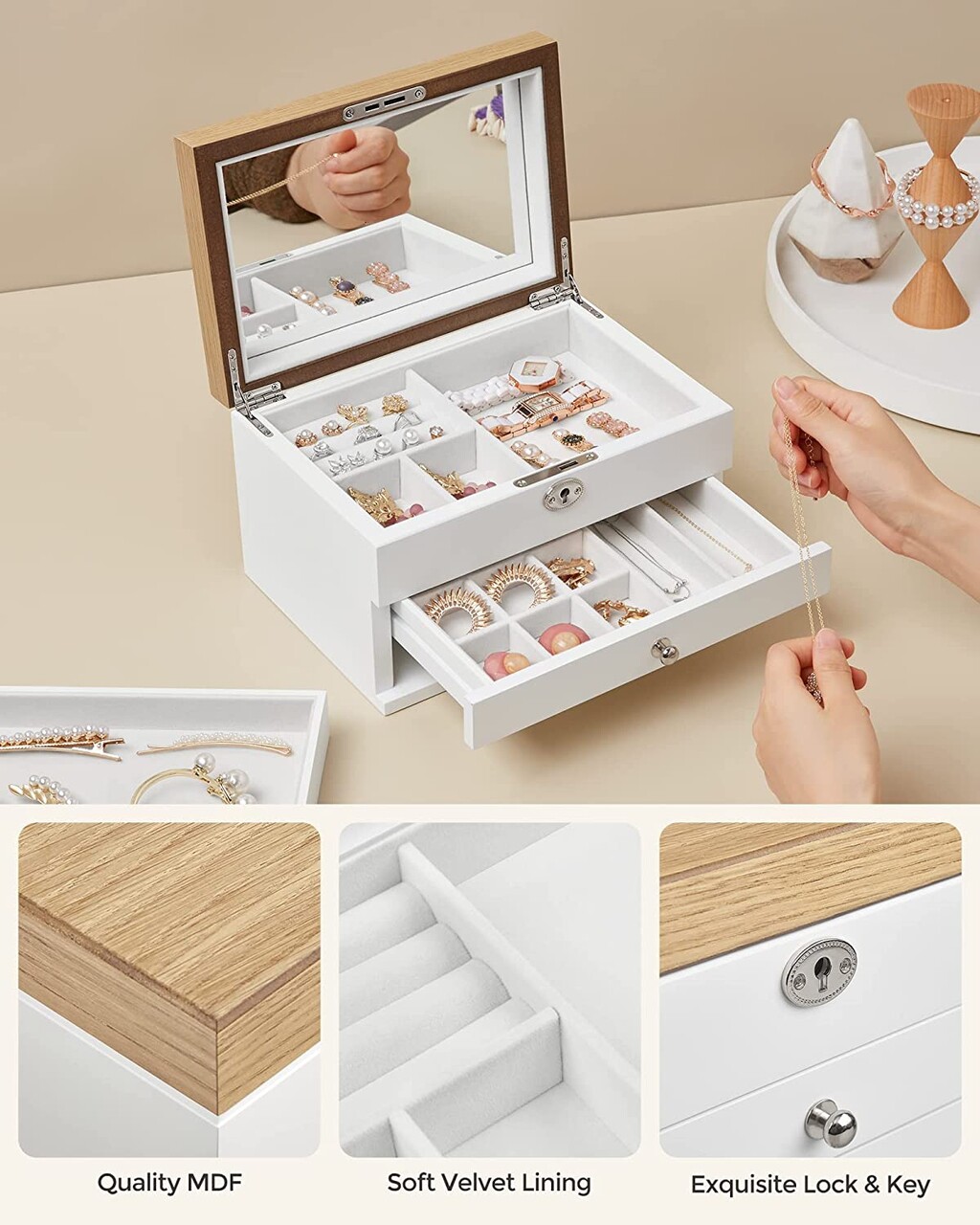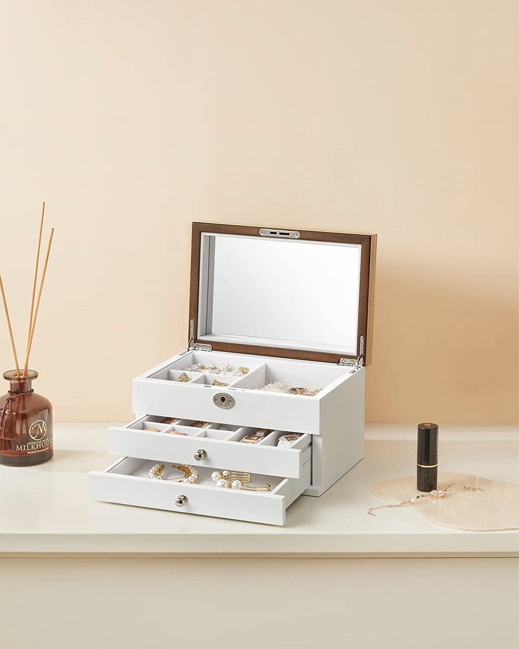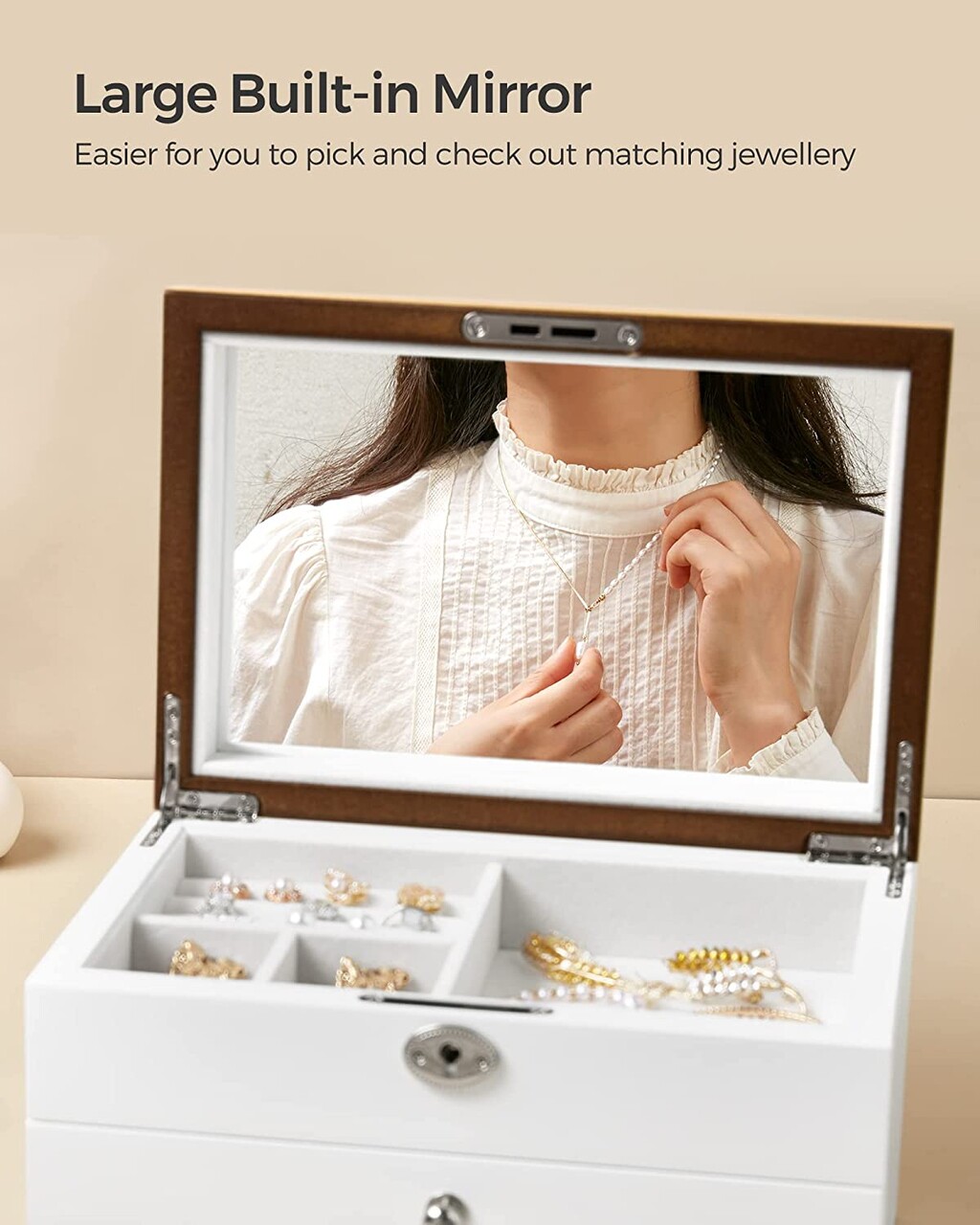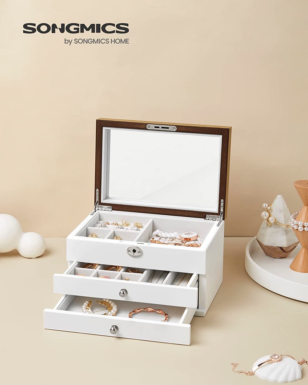 Cutie de bijuterii cu 3 etaje si oglinda, Songmics, 25x17x15 cm, MDF/catifea, alb