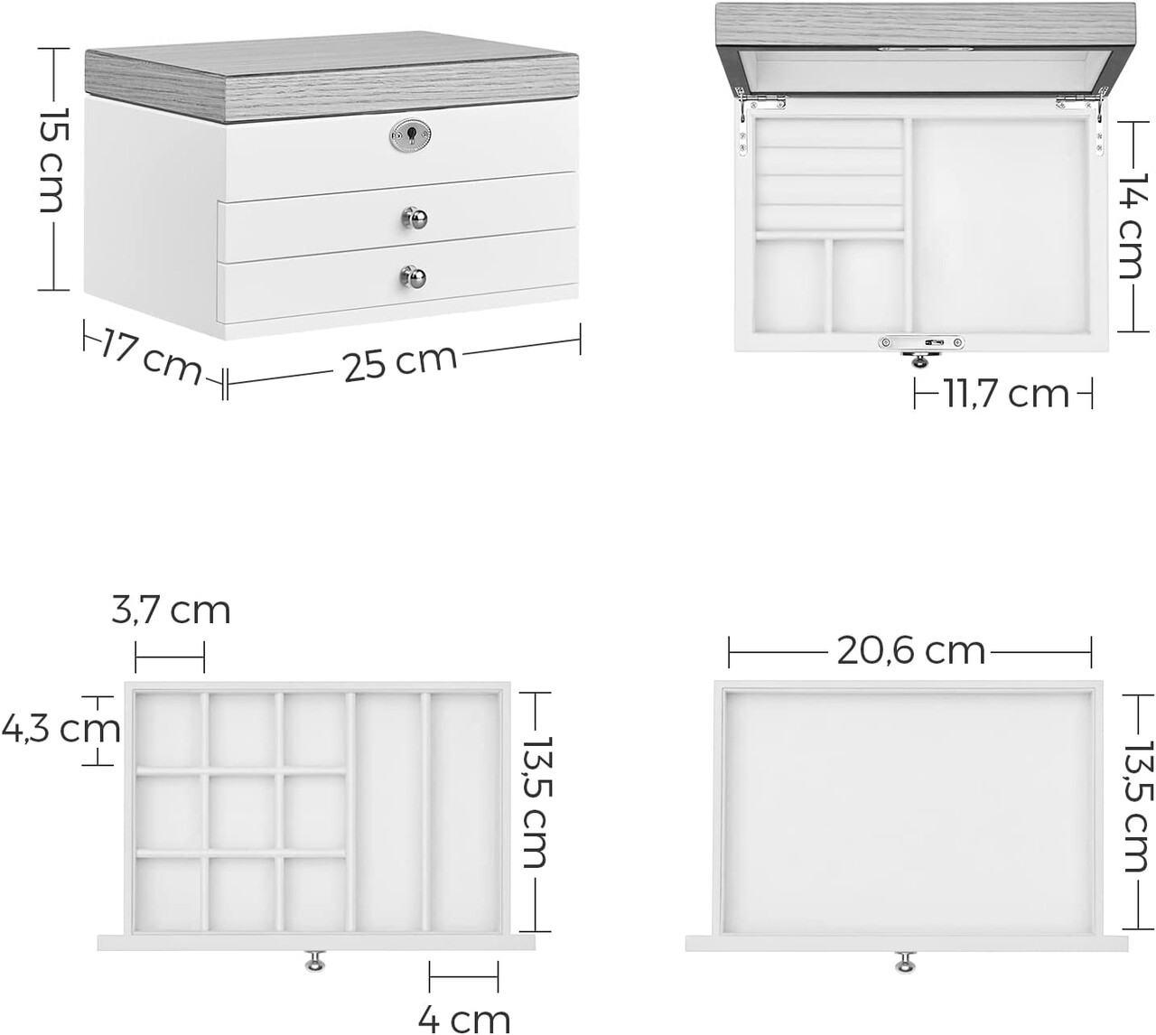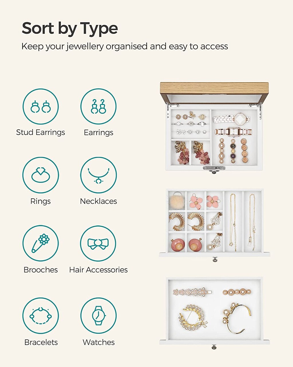 3 niveluri, depozitare compartimentata Cutia pentru bijuterii are trei niveluri, fiecare cu diverse compartimente de dimensiuni diferite, astfel incat sa va puteti organiza inelele, cerceii, bratarile si colierele intr-o singura cutie.
