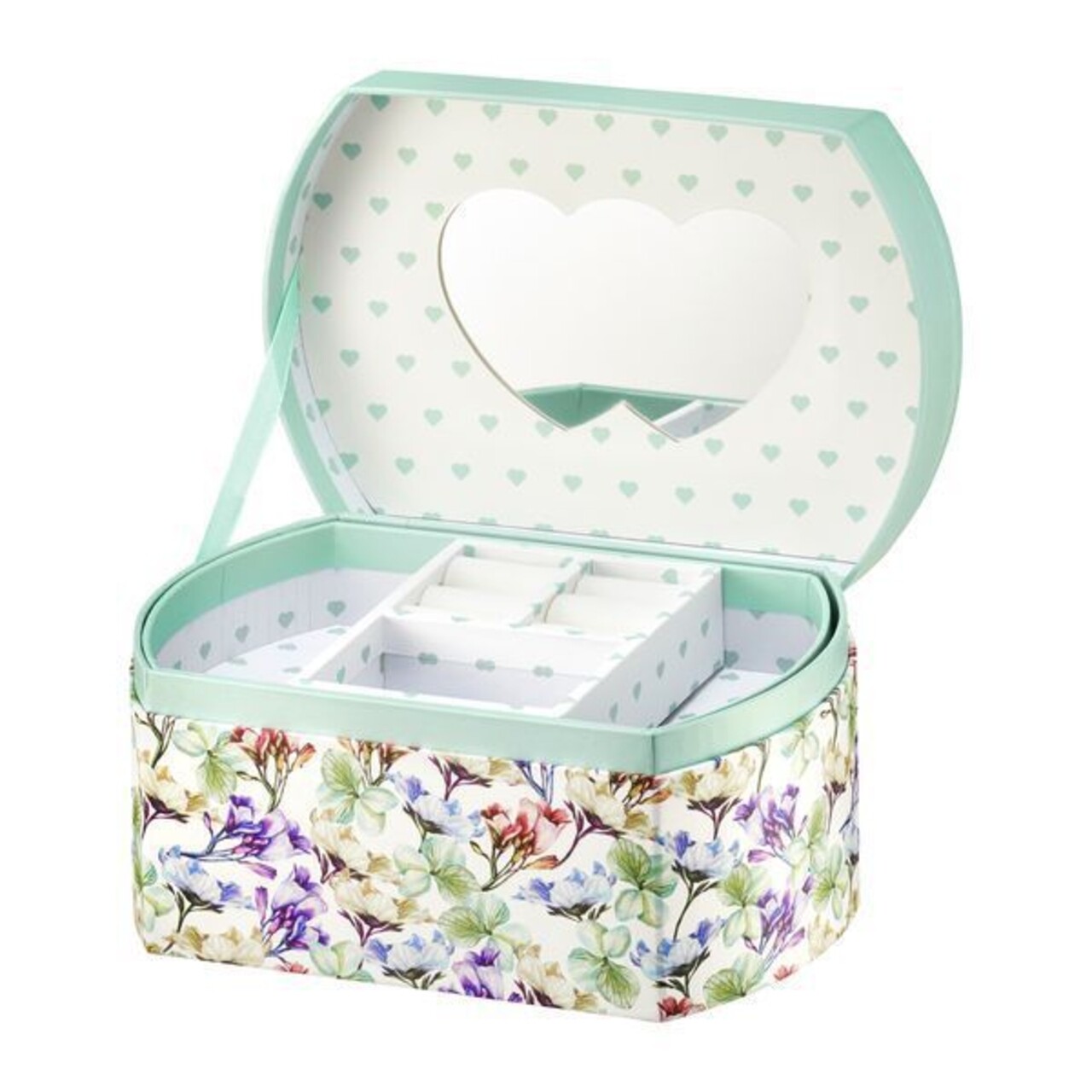 Cutie pentru bijuterii cu oglinda in interiorul capacului. Are mai multe compartimente pentru depozitarea bijuteriilor si accesoriilor mici. Cutia este realizata din placi de carton rezistente, asigurand fiabilitatea si durabilitatea.