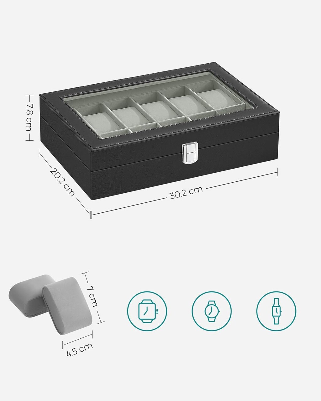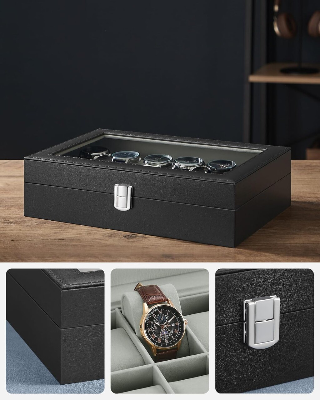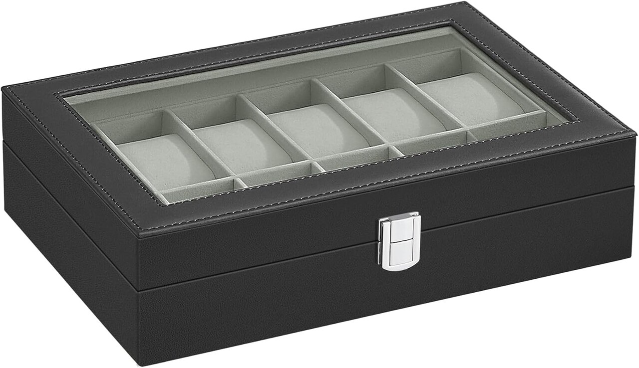 Cutie de ceasuri cu 12 compartimente, Songmics, MDF/piele ecologica/capac sticla, negru/gri