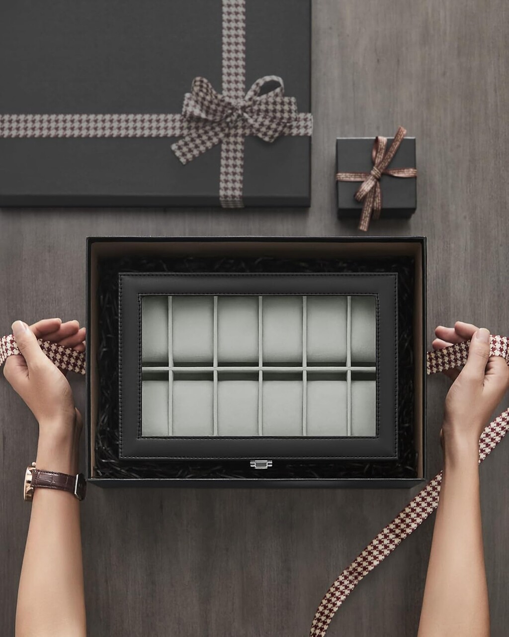 Idee excelenta de cadou Aceasta cutie pentru ceasuri este ideala drept cadou. Daca prietenii sau cei dragi sunt iubitori de ceasuri, oferiti-le in dar aceasta cutie de depozitare pentru ceasuri.