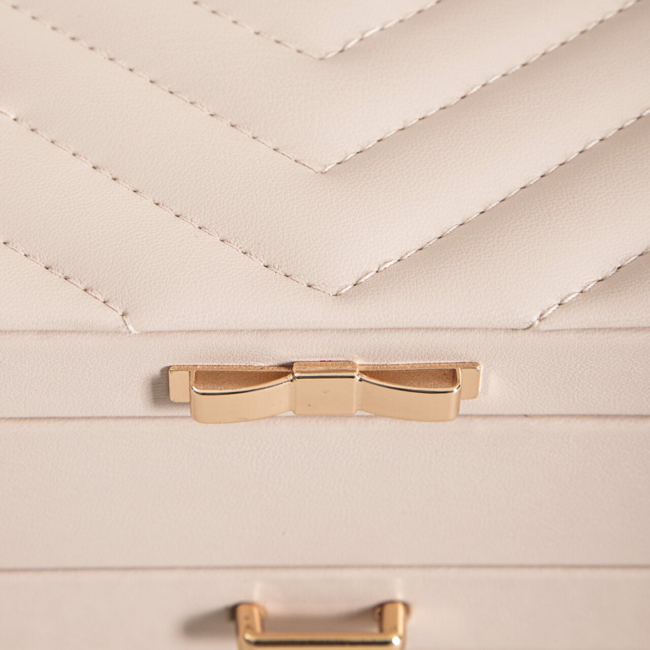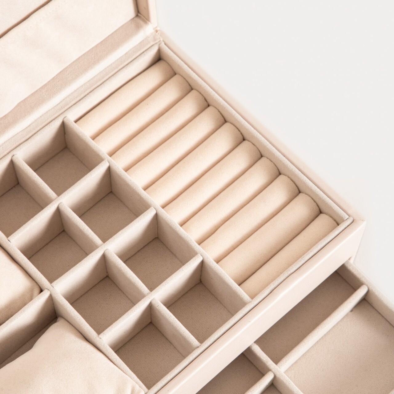 Cutia pentru bijuterii HOPE este o alegere ideala pentru cei care pretuiesc ordinea si stilul. Va fi perfecta pe masuta ta de toaleta, comoda sau ca un cadou elegant. Datorita aranjamentului bine gandit al compartimentelor, bijuteriile tale vor ramane intotdeauna ordonate si protejate impotriva zgarieturilor. Cutia de bijuterii nu numai ca va facilita selectia zilnica a bijuteriilor, dar va fi si o decoratiune interioara frumoasa.