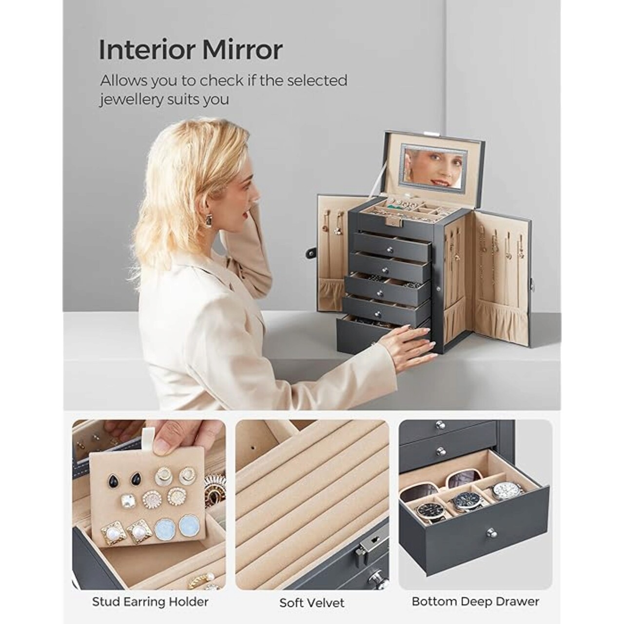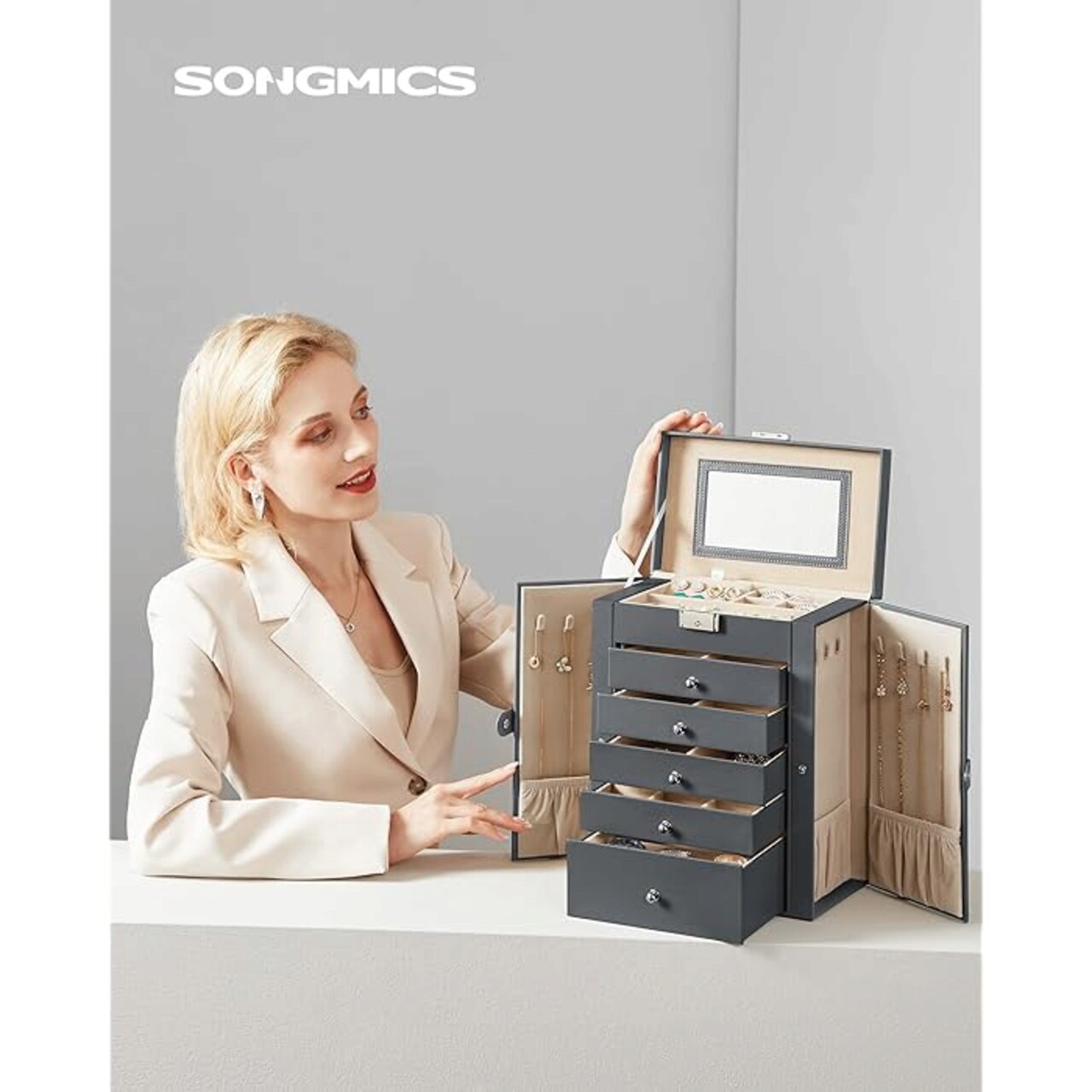 Cutie pentru bijuterii cu 6 etaje, 5 sertare si oglinda Songmics, 26x15x32 cm, MDF, catifea/sticla, gri