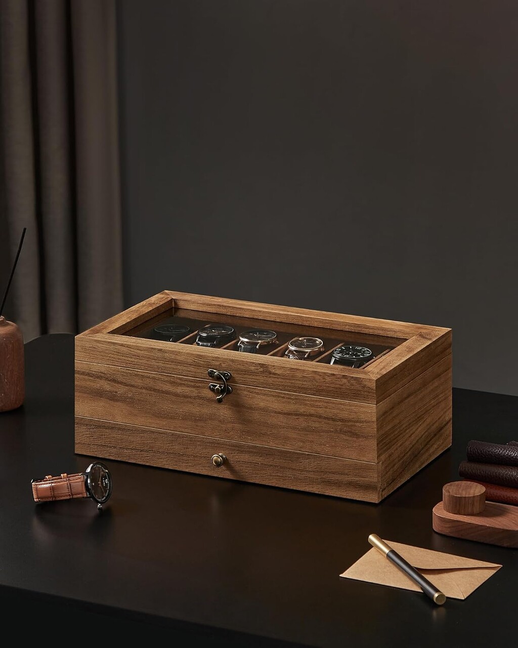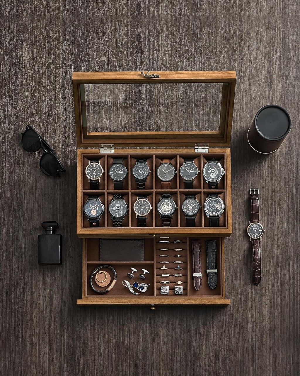 Depozitare organizata Primul nivel include 12 compartimente pentru ceasuri, iar sertarul inferior dispune de spatii dedicate pentru curele, butoni sau inele.