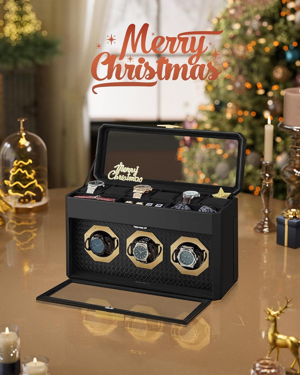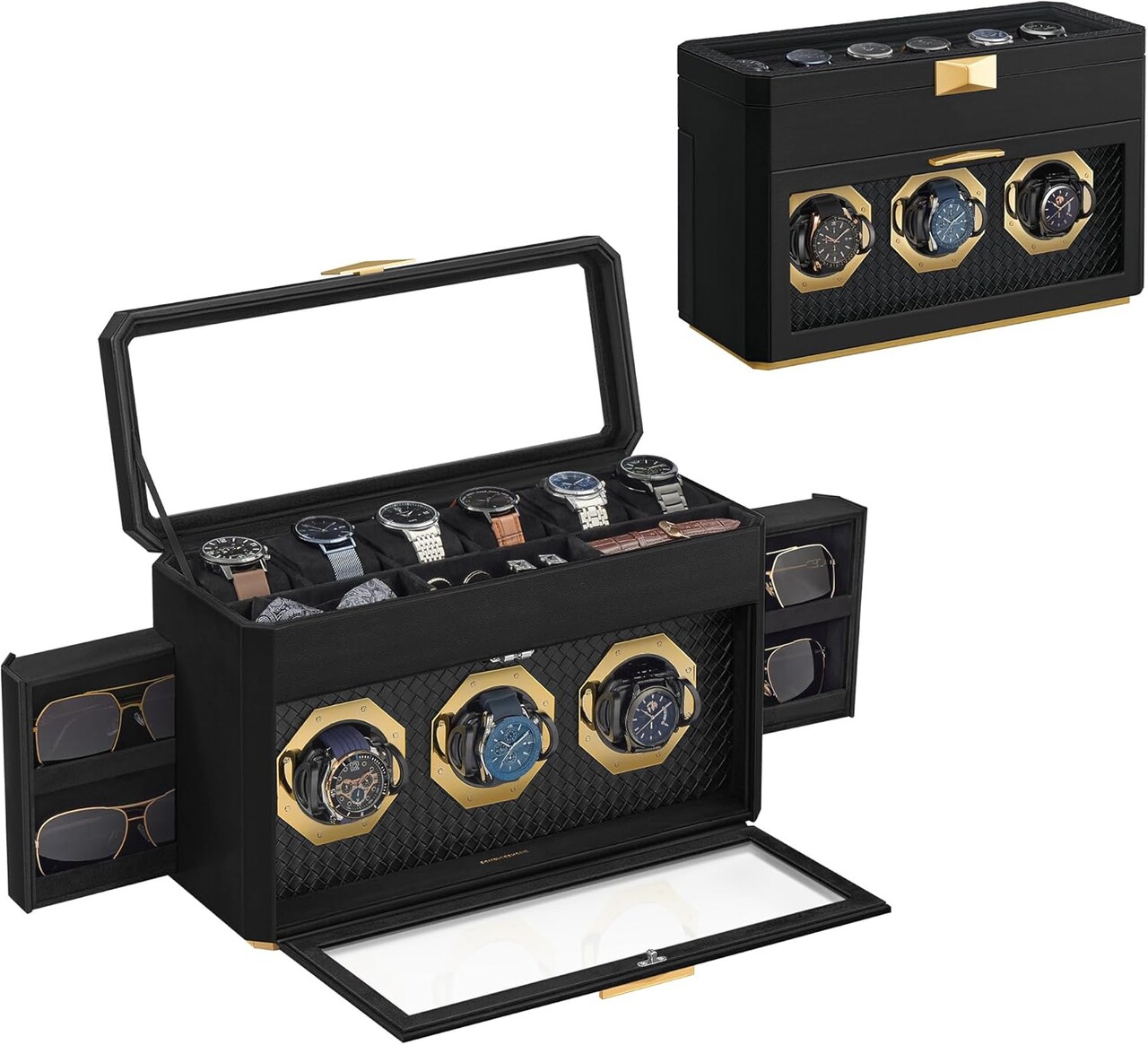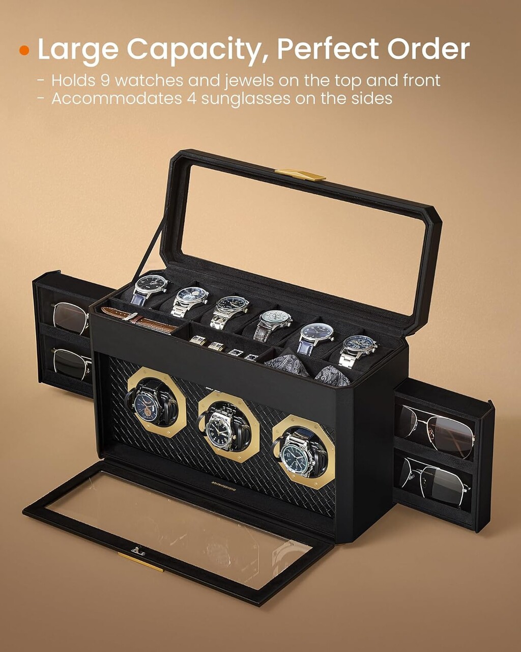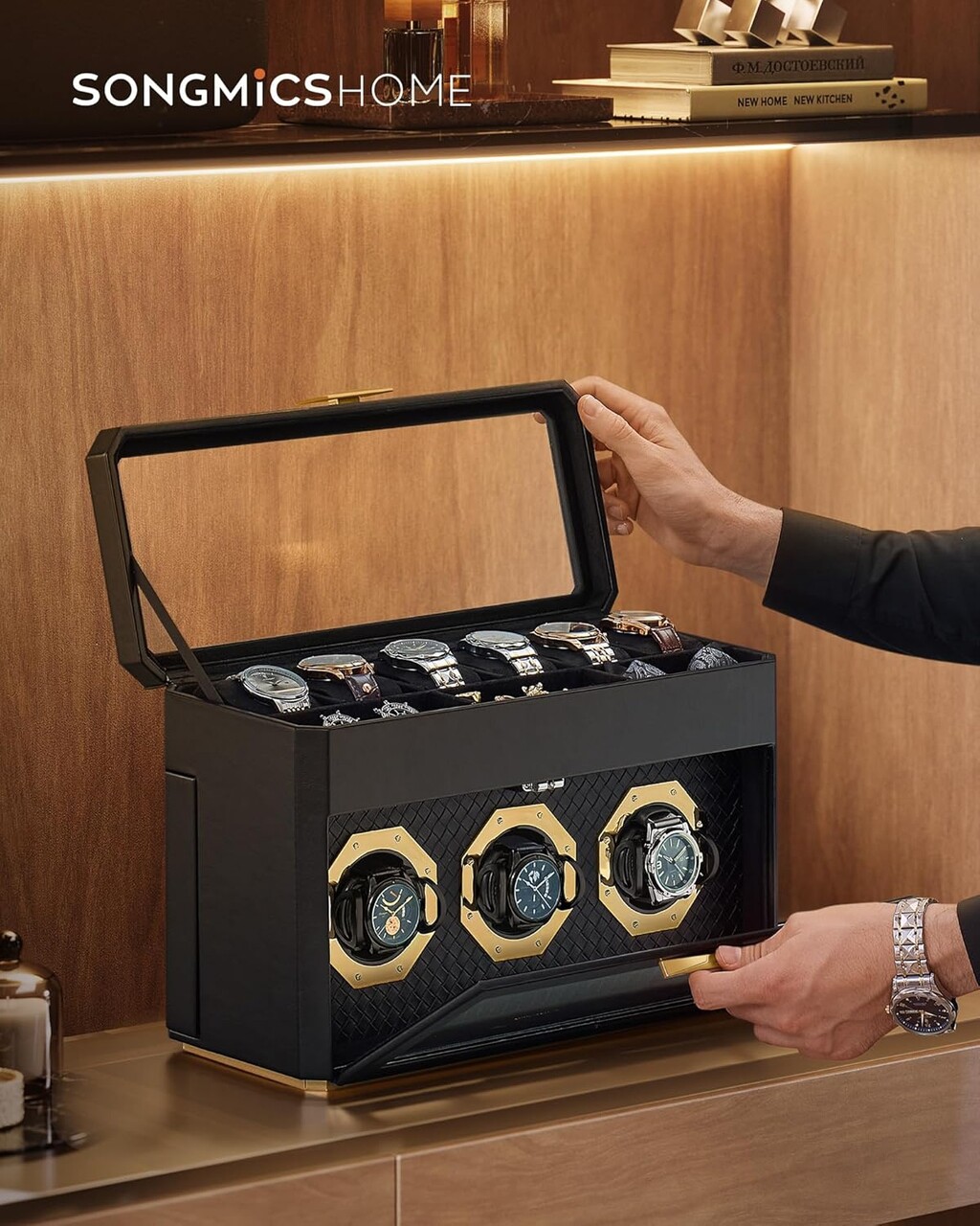 Cu 6 sloturi spatioase si 3 suporturi ajustabile pentru ceasuri, 4 locuri pentru ochelari in sertarele laterale si spatii pentru inele si curele - aceasta cutie acopera toate nevoile de organizare.