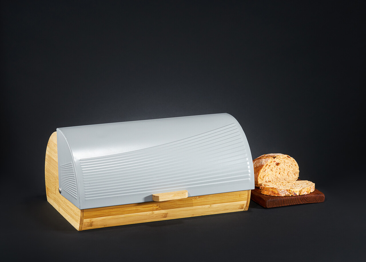 Cutie pentru paine cu capac metalic Natural, Ambition, 39x28x18.5 cm, bambus/metal, natur/gri
