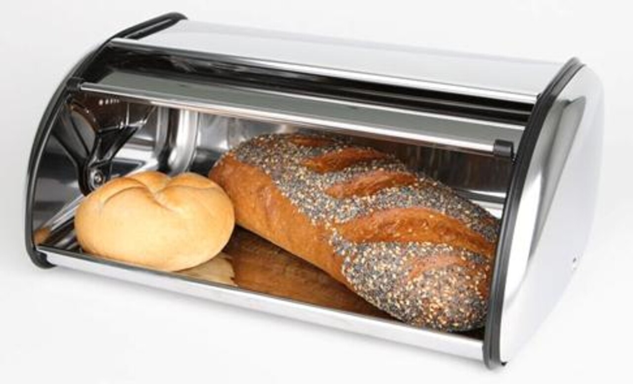 Cutie pentru depozitarea si pastrarea proaspata a painii, din otel inoxidabil, cu un aspect modern.